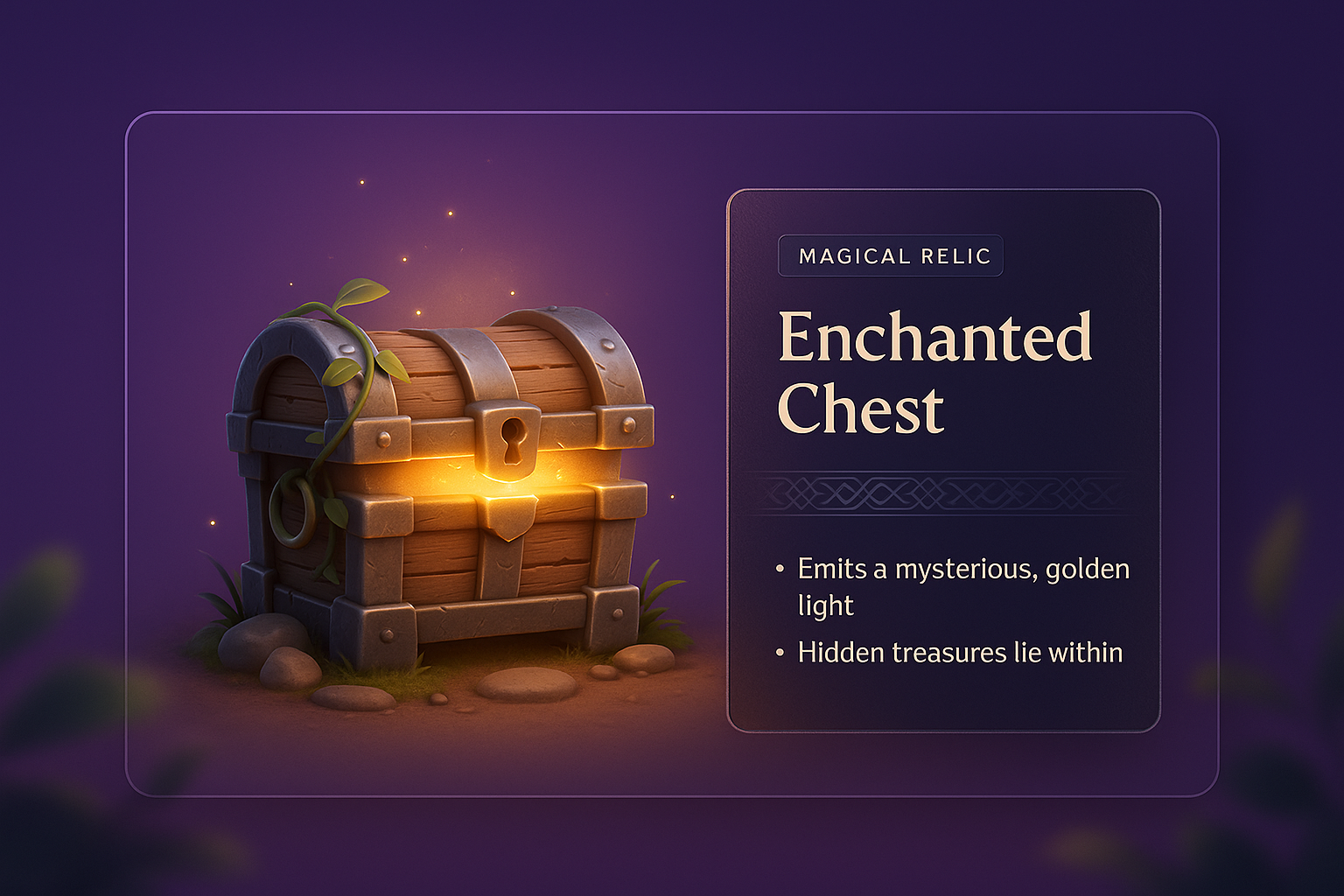 A beautifully designed 3D illustration of an enchanted chest emitting a golden light, surrounded by a soft gradient background. The chest hints at hidden treasures within.