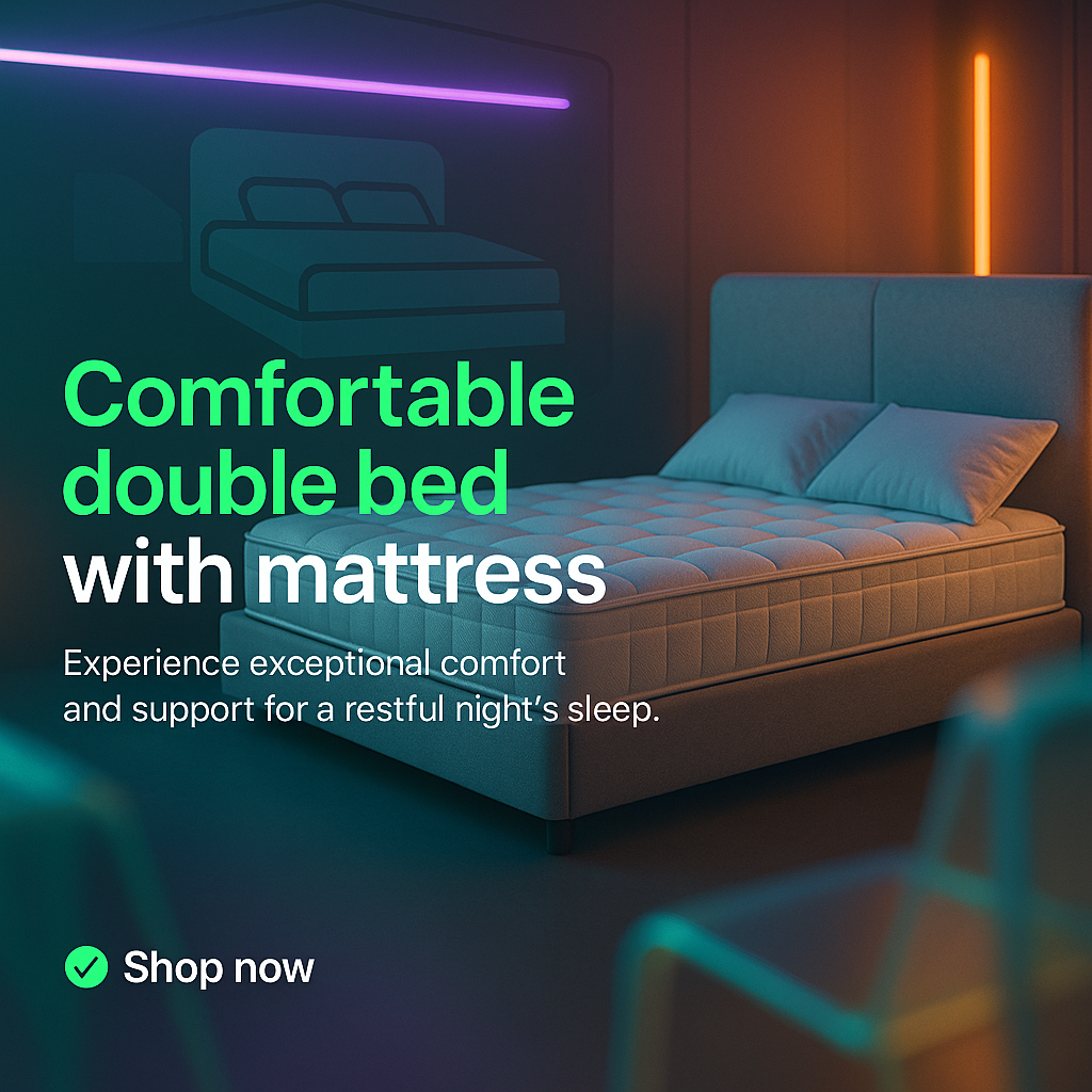 /Collection: /by davooda/Type: PNG/Stylish product showcase image of a comfortable double bed with a mattress, designed for e-commerce. The modern aesthetic and vibrant lighting enhance visual appeal for potential buyers.