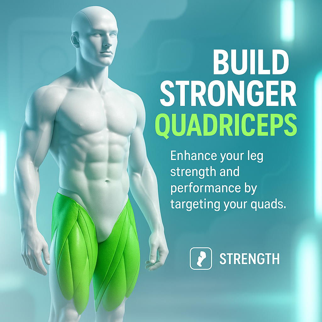 /Collection: /by davooda/Type: PNG/Informative fitness graphic showcasing a muscular figure with highlighted quadriceps, designed for promoting leg strength training. Ideal for gyms and fitness programs.