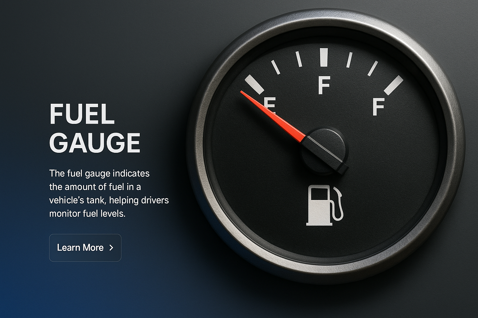 A modern web page design featuring a detailed fuel gauge illustration, clear text, and an action button. The layout combines a gradient background with a realistic fuel gauge element.