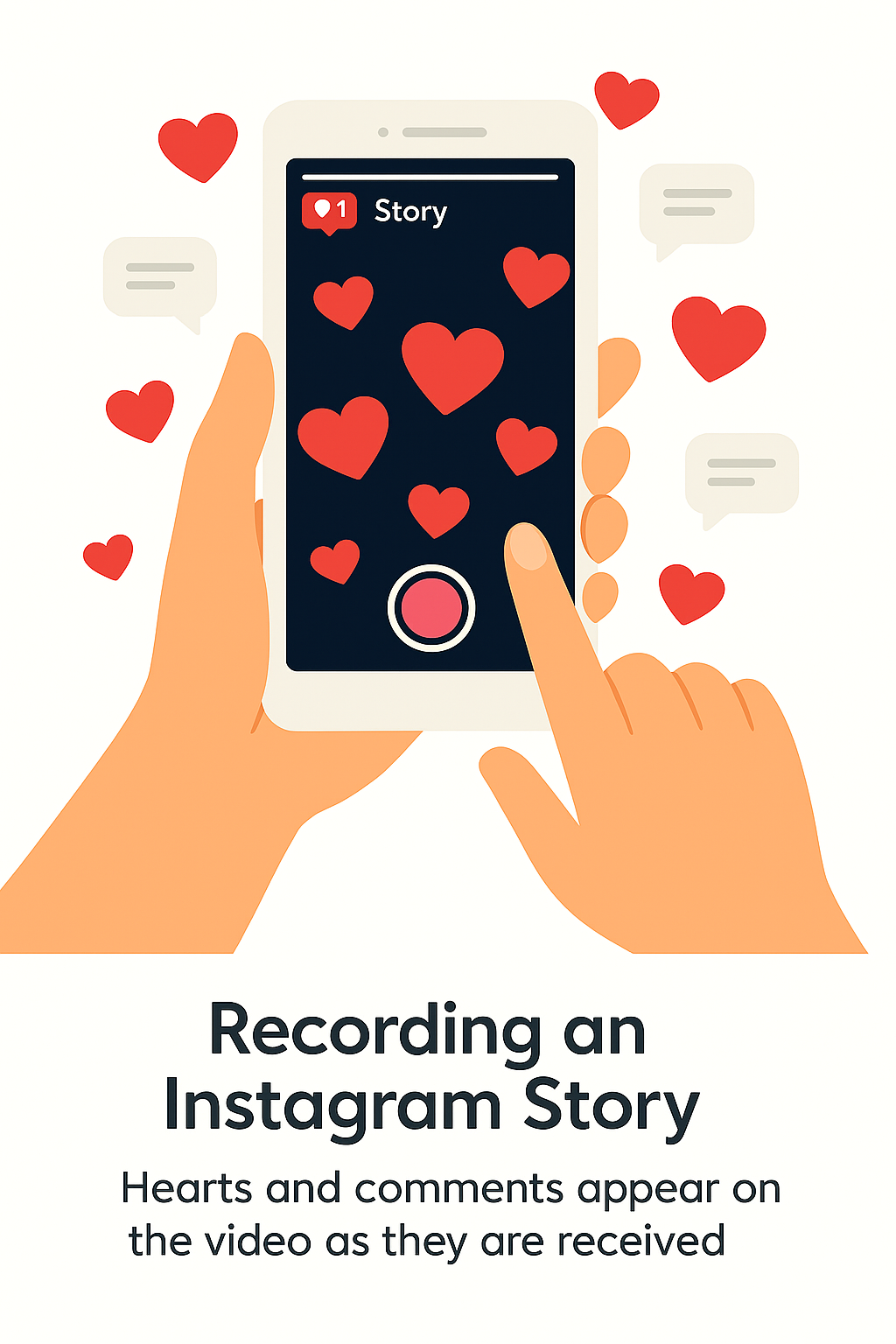 /Collection: /by davooda/Type: PNG/Stylized graphic depicting hands holding a smartphone while recording an Instagram story, featuring animated hearts and comments, suitable for social media content.