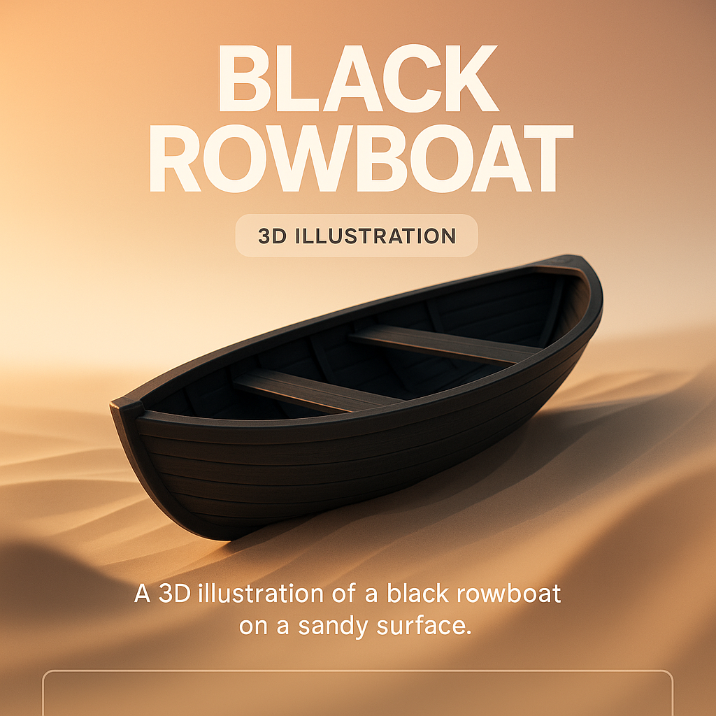 A detailed 3D illustration showcasing a black rowboat situated on a sandy surface, ideal for use in digital art, advertisements, or creative projects.