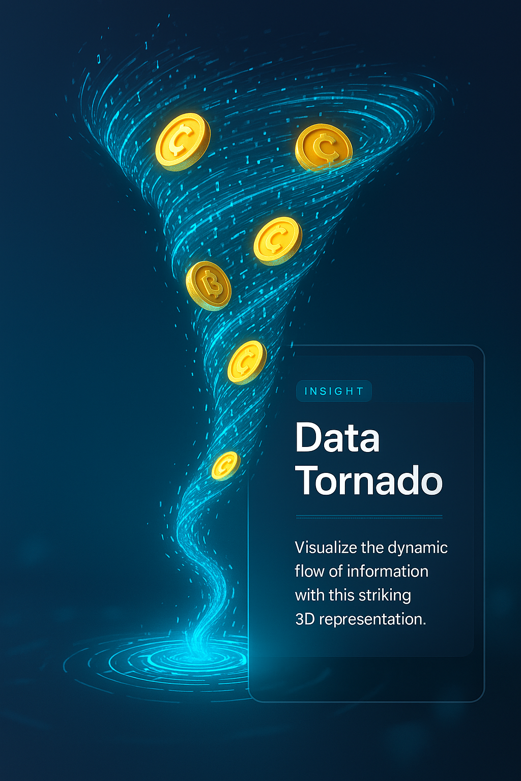 /Collection: /by davooda/Type: PNG/A captivating 3D illustration depicting a swirling tornado of data with glowing coins. The design features a gradient background and integrated text elements for a cohesive look.