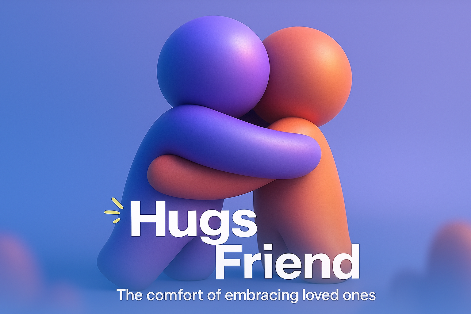 A vibrant 3D scene depicting two stylized figures embracing, symbolizing friendship and comfort. The background features a smooth gradient, enhancing the emotional tone.