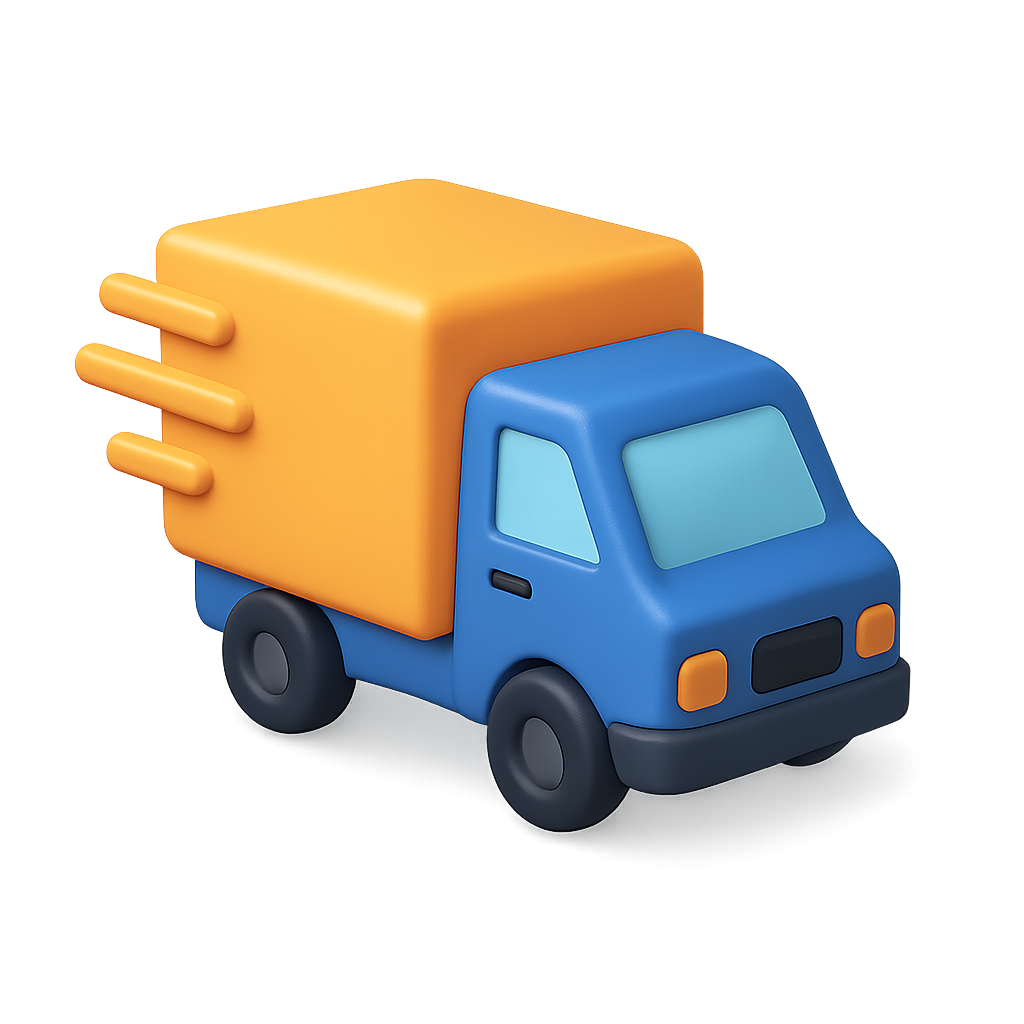 A vibrant 3D icon of a delivery truck in motion, featuring a blue body and an orange cargo box. The design has a transparent background, highlighting a playful and modern isometric style.