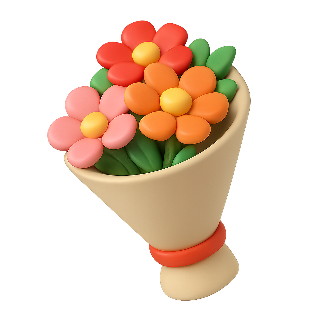 A vibrant 3D icon of a bouquet featuring colorful flowers in a cone-shaped holder. The design showcases a three-quarter view with a playful isometric style, highlighting the volumetric feel.