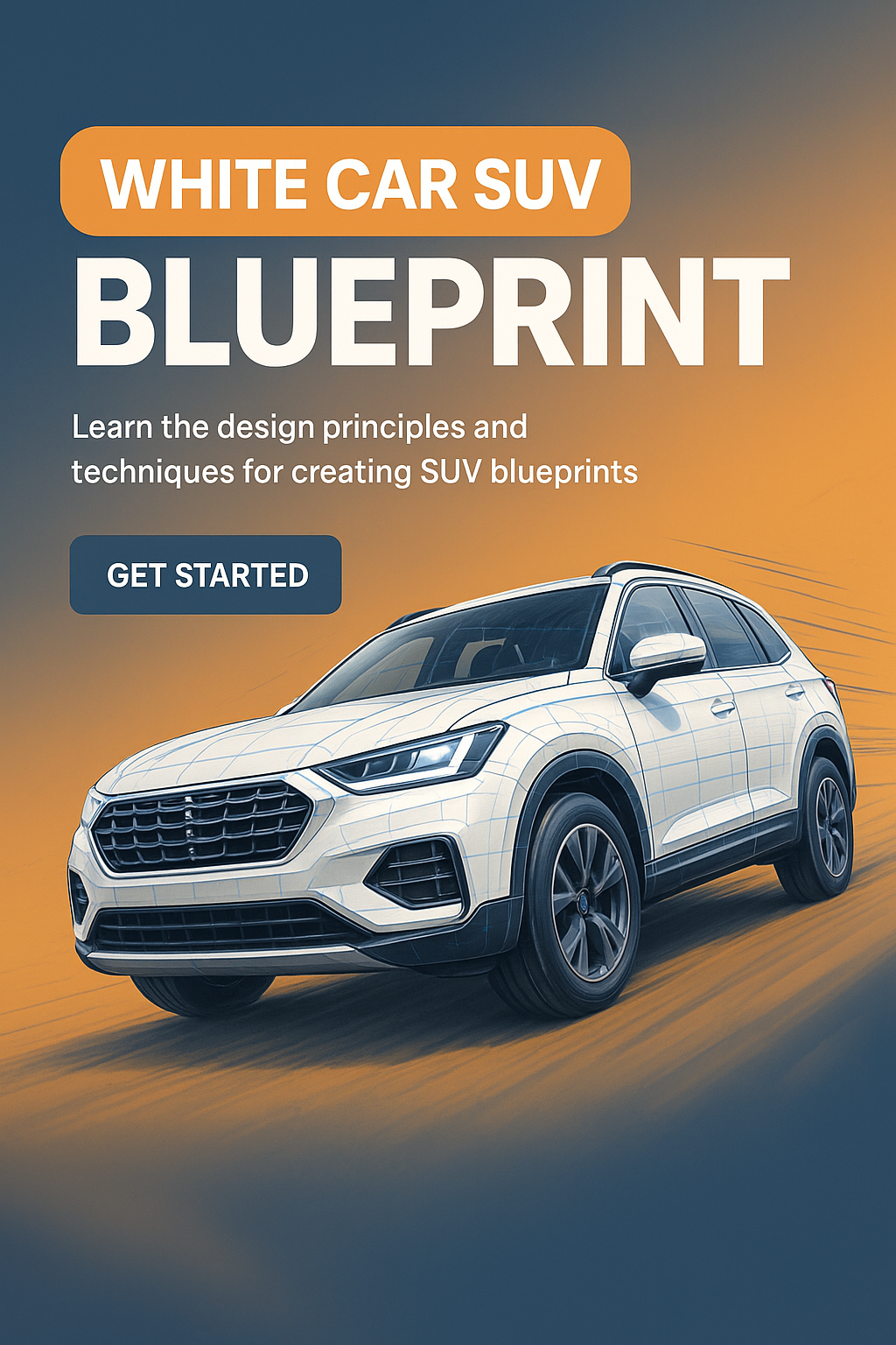 This image is a promotional graphic for a blueprint guide on designing SUVs. It features a stylized white SUV with a blueprint overlay, appealing to automotive design enthusiasts.