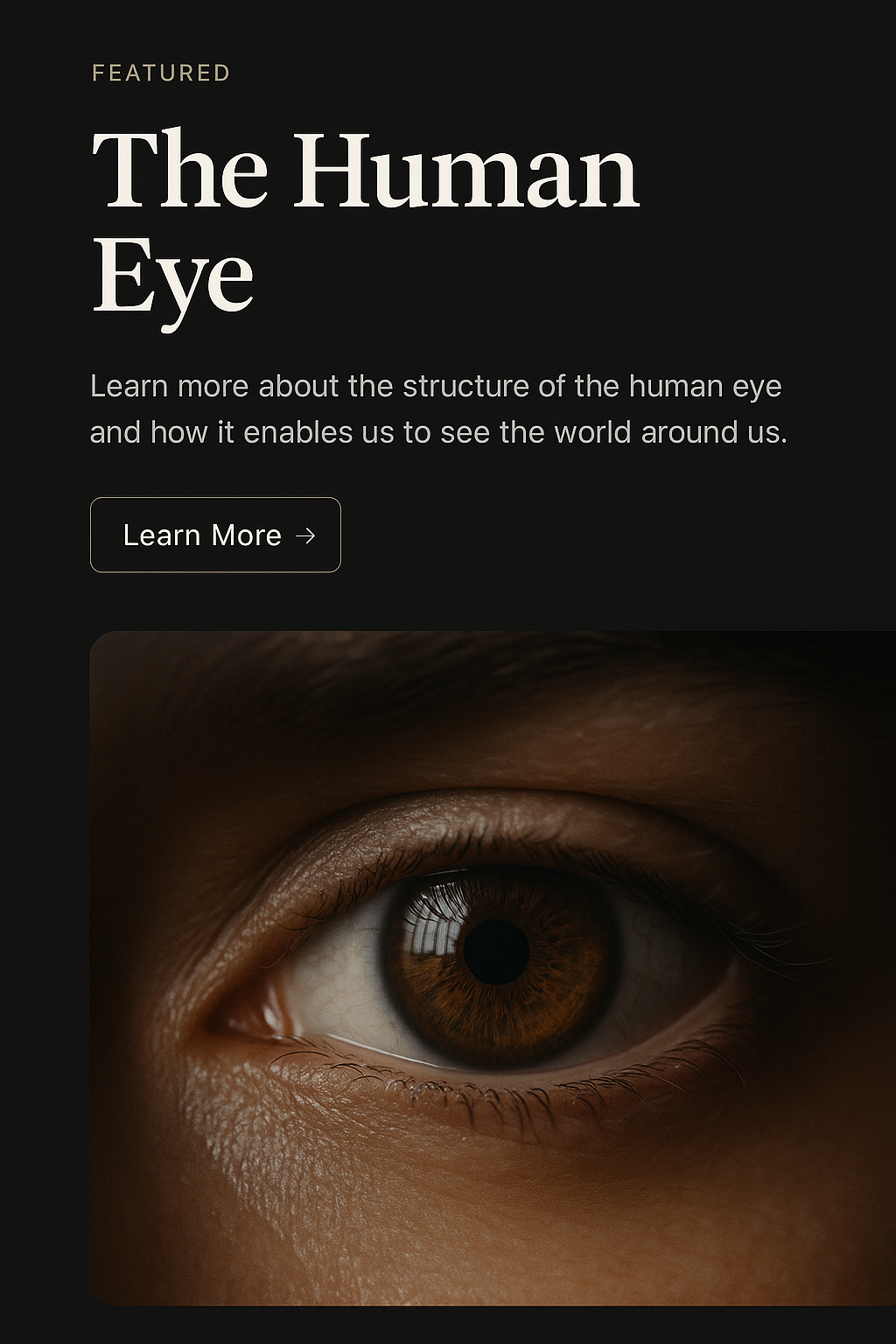A sleek web page design showcasing a close-up of a human eye, with a prominent title and informative text. The layout is modern with a clear call-to-action button.