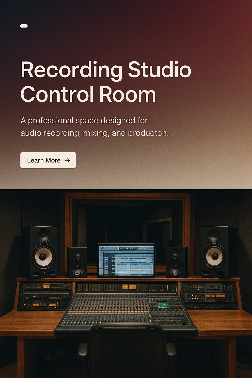 A stylish recording studio control room featuring a professional setup with audio equipment, showcasing a gradient background and informative text elements.