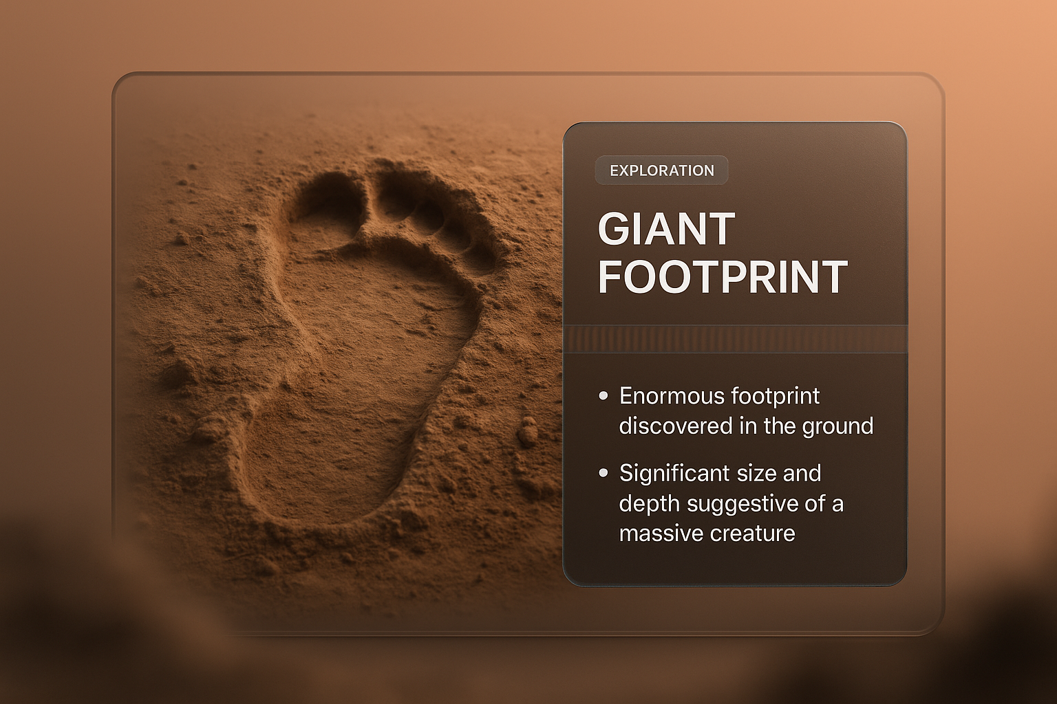 A striking 3D illustration of a giant footprint embedded in textured ground, enhanced with a dark overlay featuring descriptive text and graphic elements.