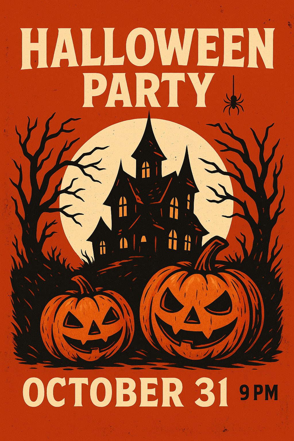 A vibrant Halloween party poster featuring a haunted house and carved pumpkins, designed in a retro style. Ideal for event promotion during the spooky season.