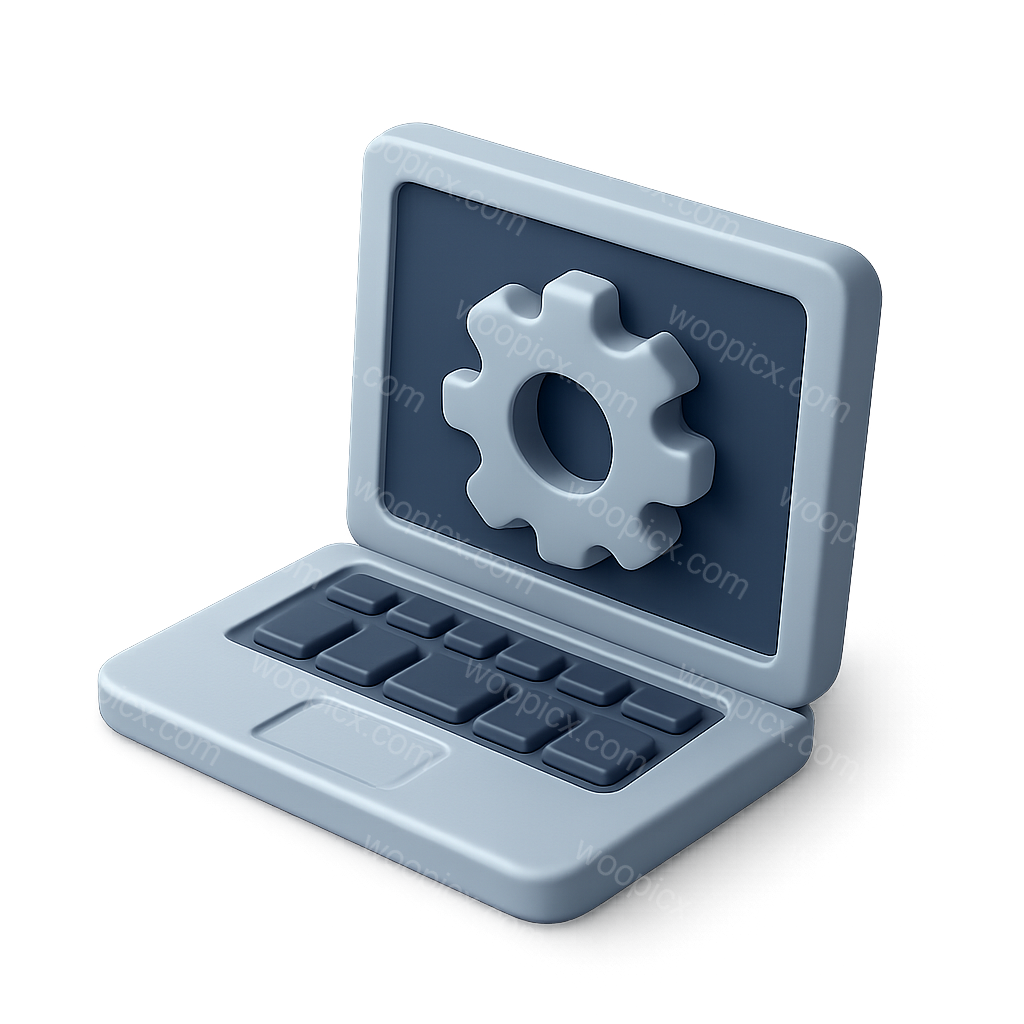 /Premium/Collection: /by davooda/Type: PNG/A three-dimensional icon of a laptop featuring a prominent gear design on the screen. The laptop is depicted in a three-quarter view with a soft color palette and a transparent background, enhancing its isometric appearance.