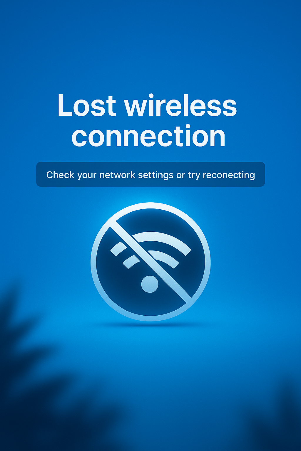 This image is a digital notification banner indicating a lost wireless connection, featuring a simple design with a blue background and an icon. It is intended for tech support or user guidance.