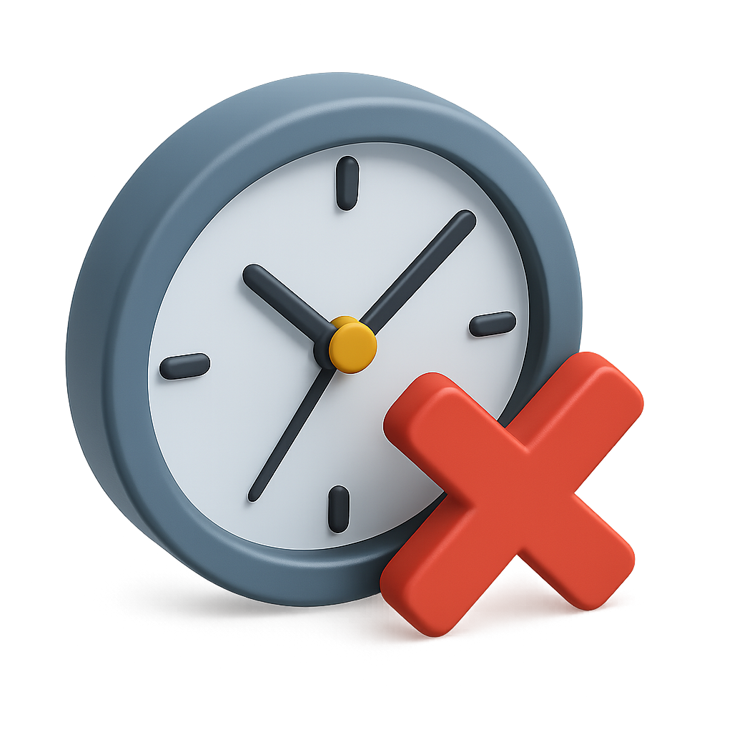 /Collection: /by davooda/Type: PNG/A 3D clock icon featuring a red cancel mark, designed with a transparent background and an isometric view. The clock displays traditional hour and minute hands with a modern aesthetic.