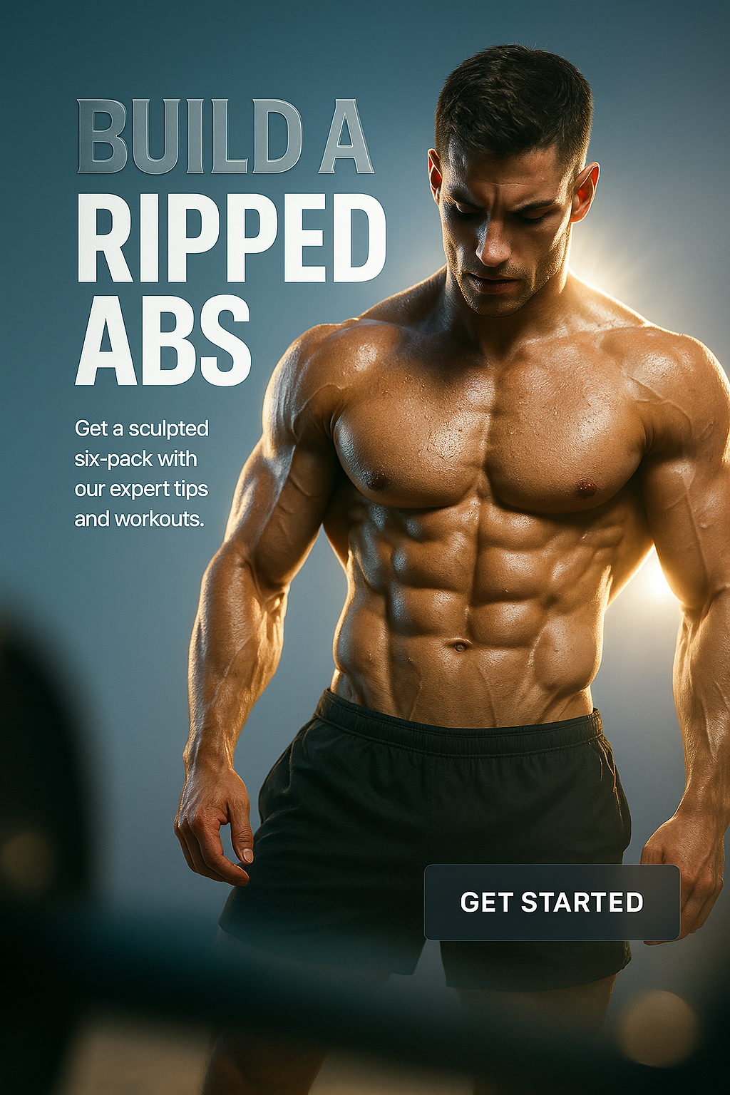 A motivational fitness image showcasing a muscular man highlighting abs. It serves as a promotional social media post aimed at fitness enthusiasts seeking workout tips.