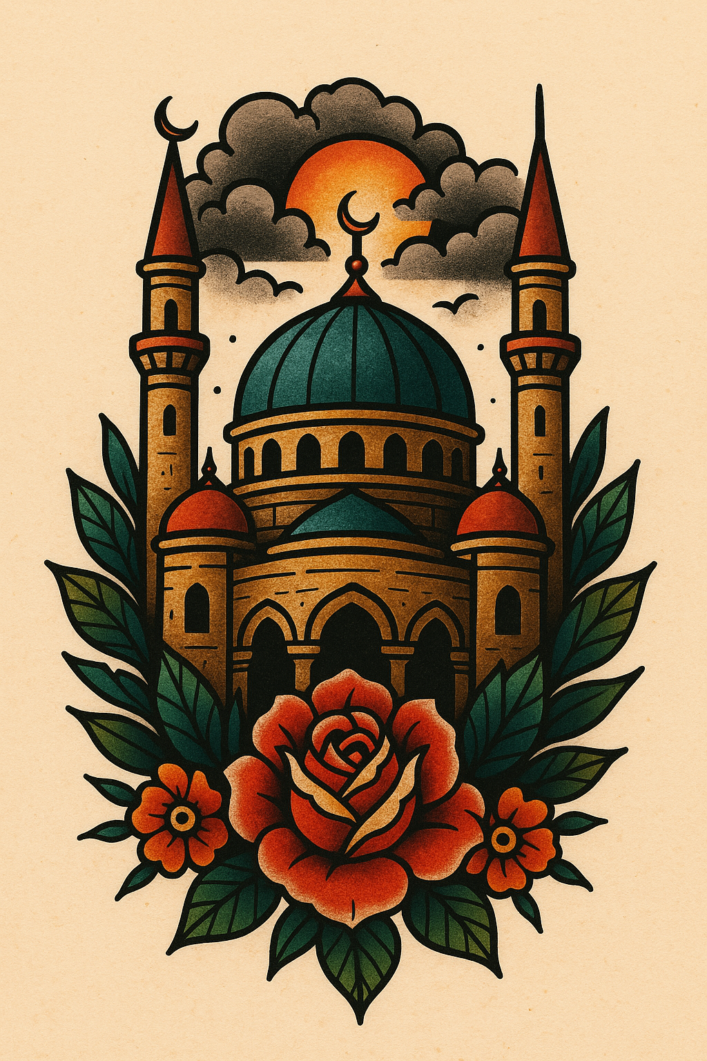 /Collection: /by davooda/Type: PNG/This is a vibrant illustration featuring a mosque surrounded by roses and leaves, showcasing a blend of cultural and floral motifs. Ideal for art prints or decorative purposes.