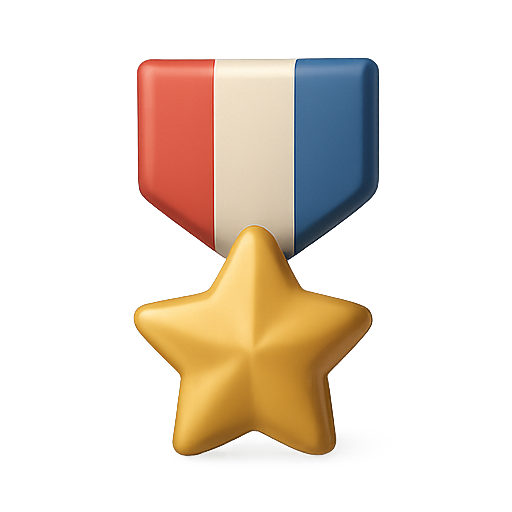 A visually striking 3D icon featuring a medal with the colors of the French flag and a prominent golden star. Ideal for award or achievement representations in digital media.