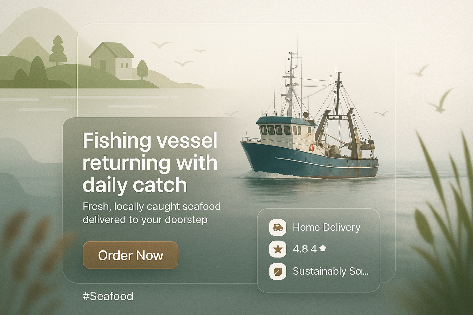 /Collection: /by davooda/Type: PNG/A visually appealing promotional graphic showcasing a fishing vessel returning with its daily catch, emphasizing fresh seafood delivery. Ideal for marketing campaigns targeting seafood enthusiasts.