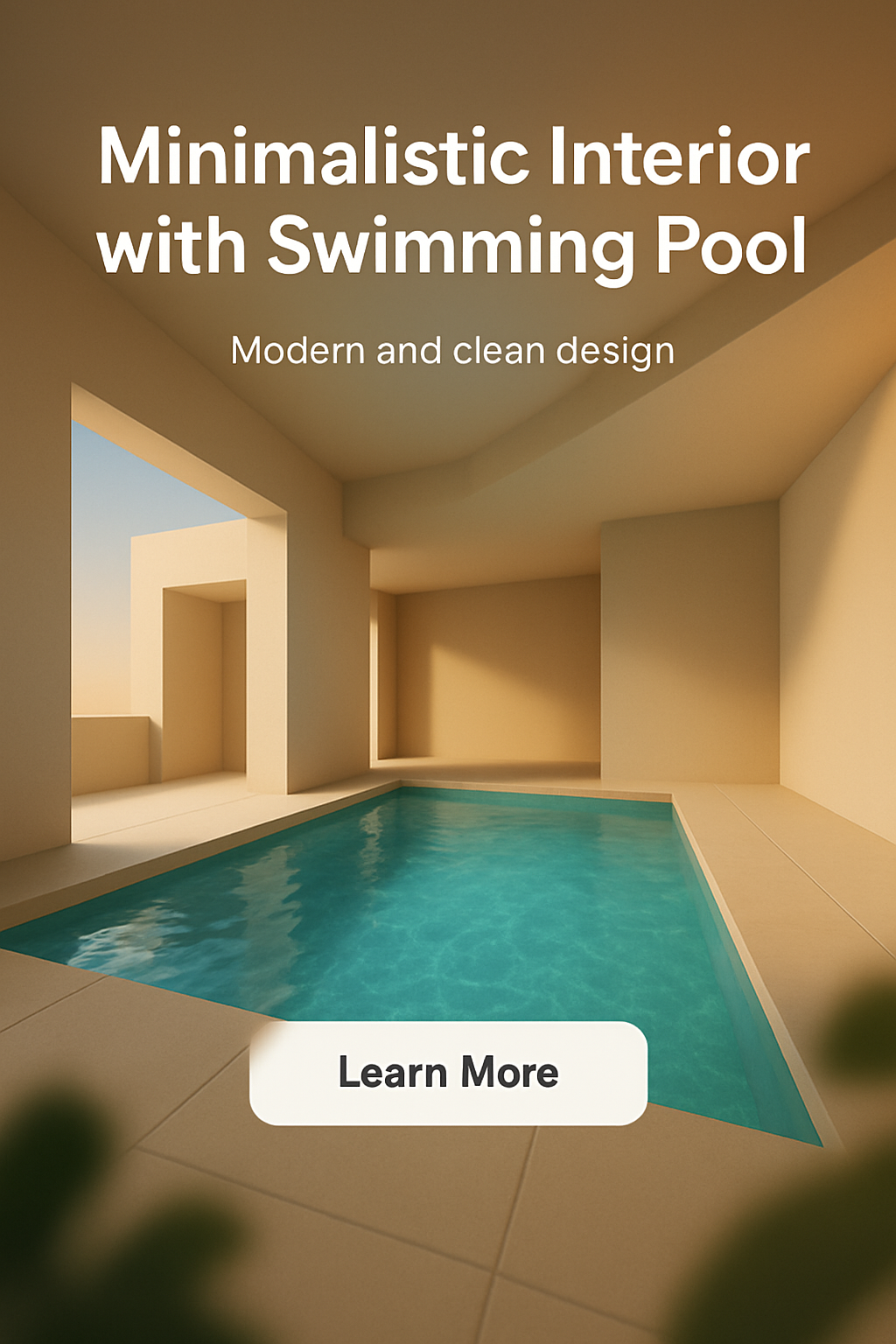 This graphic portrays a modern, minimalistic interior design featuring a swimming pool. It uses a clean aesthetic suitable for promotional purposes.