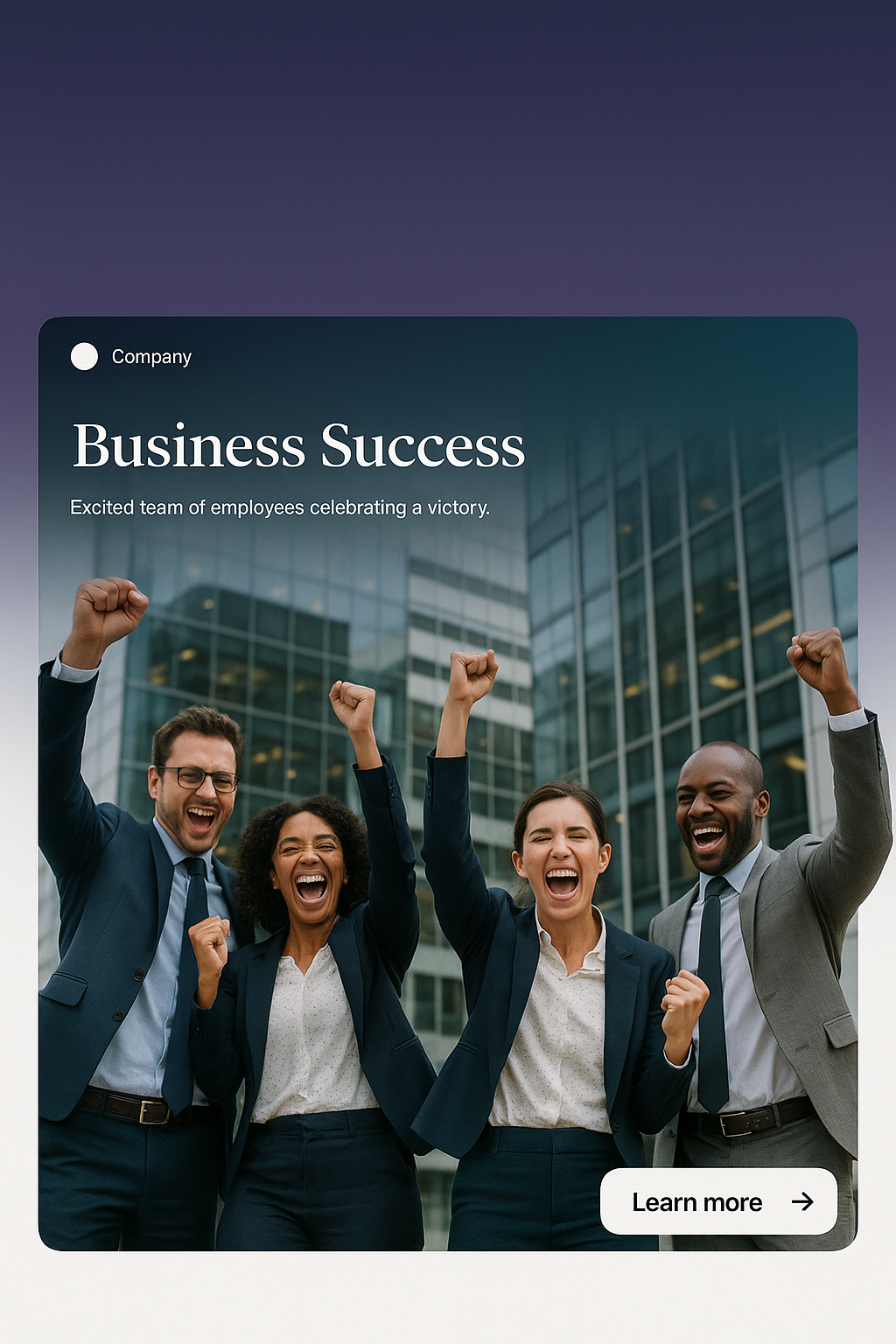 /Collection: /by davooda/Type: PNG/A diverse group of business professionals joyfully celebrating a victory with fists raised in the air. The scene captures their excitement in front of a modern corporate building.