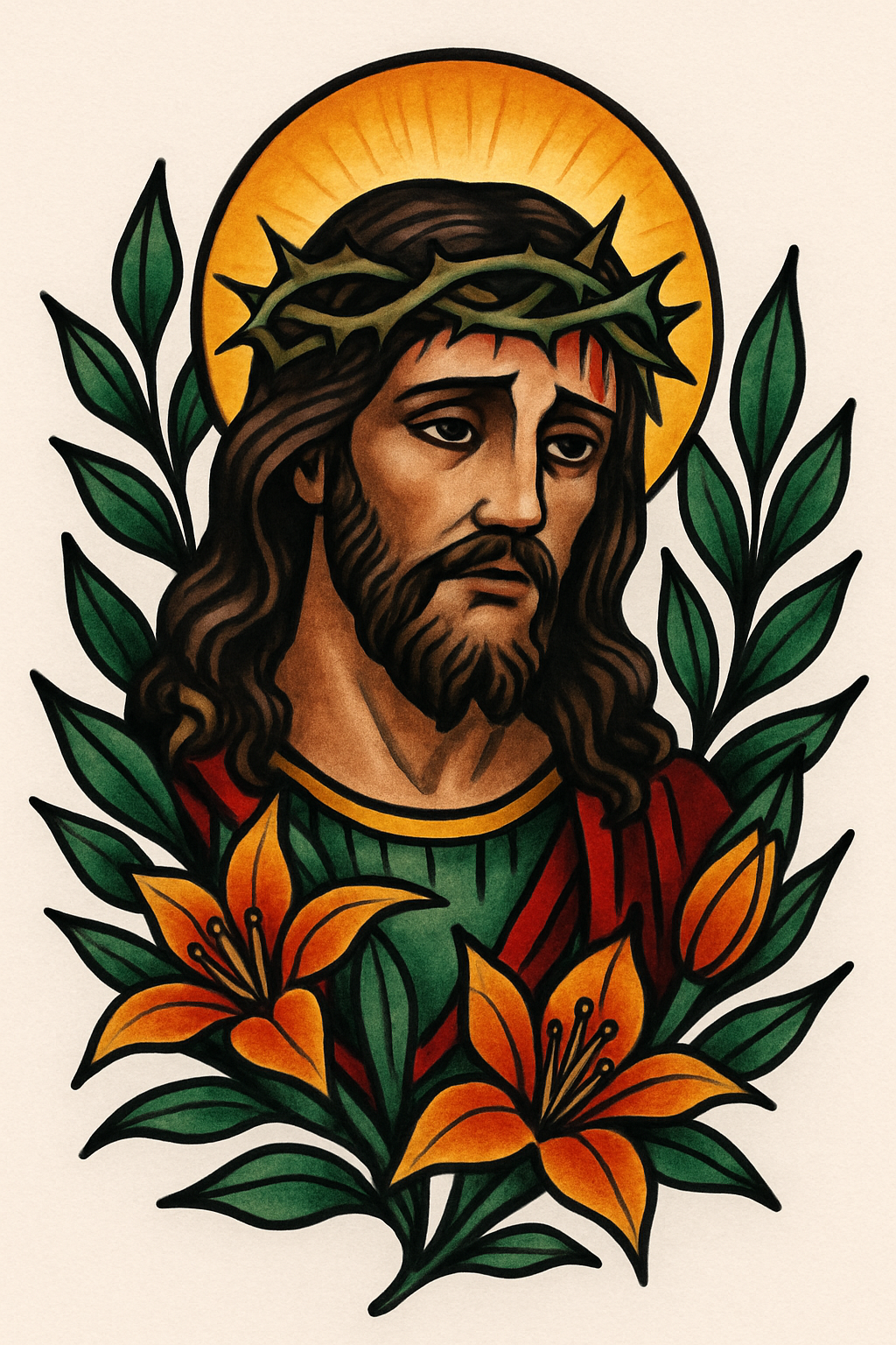 Vibrant Tattoo Style Illustration of a Saint with Roses