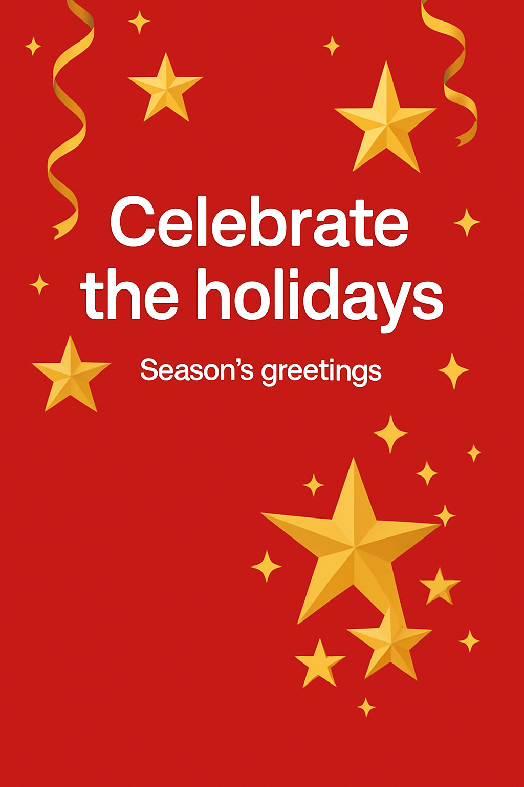 A vibrant holiday greeting card featuring a red background with golden stars and festive elements, ideal for seasonal celebrations and greetings.