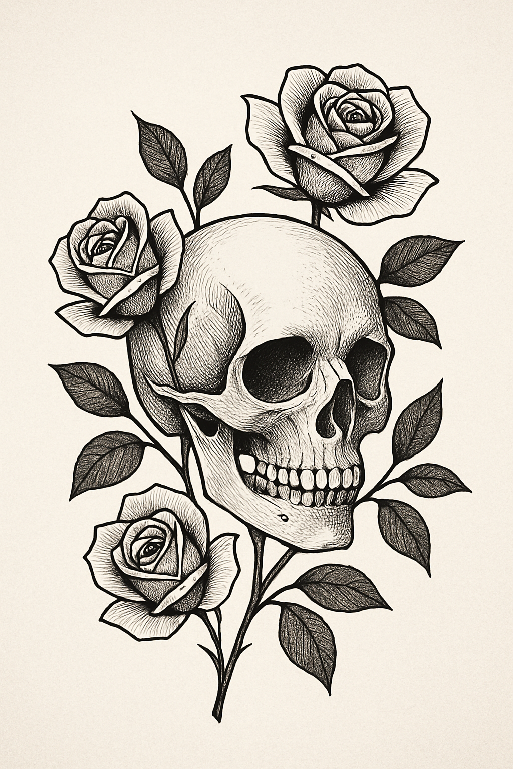 Intricate Skull and Rose Artwork for Tattoo or Decorative Use