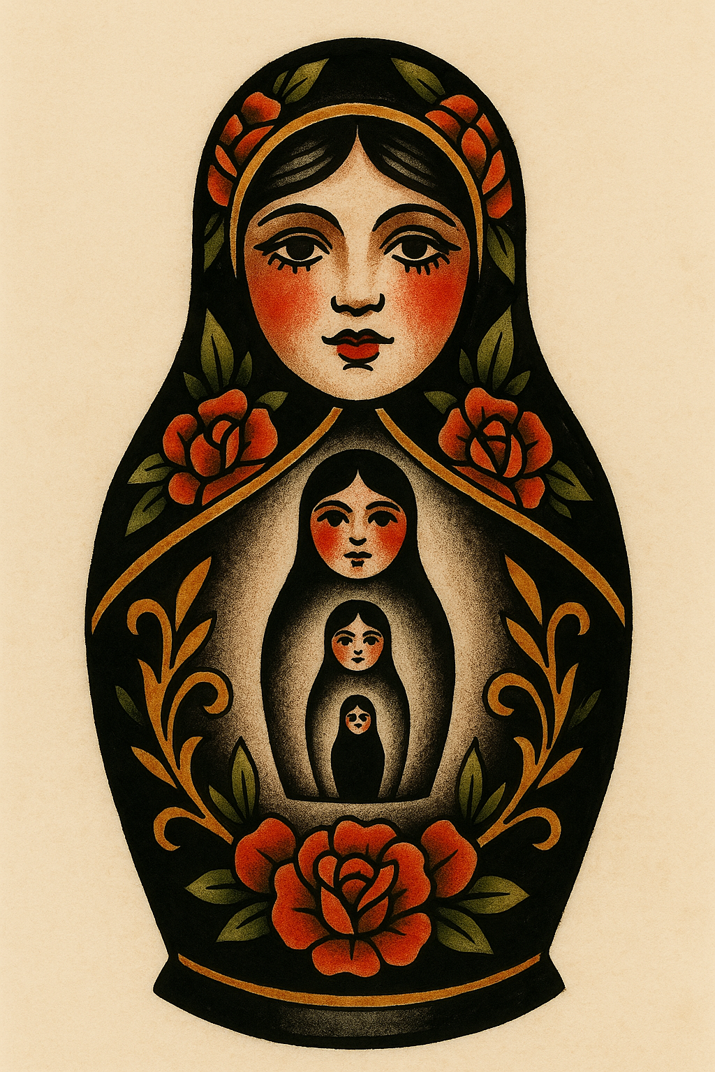 A beautifully crafted tattoo design featuring a Matryoshka doll with intricate details. The doll showcases several smaller versions within, adorned with vibrant floral patterns on a beige background.