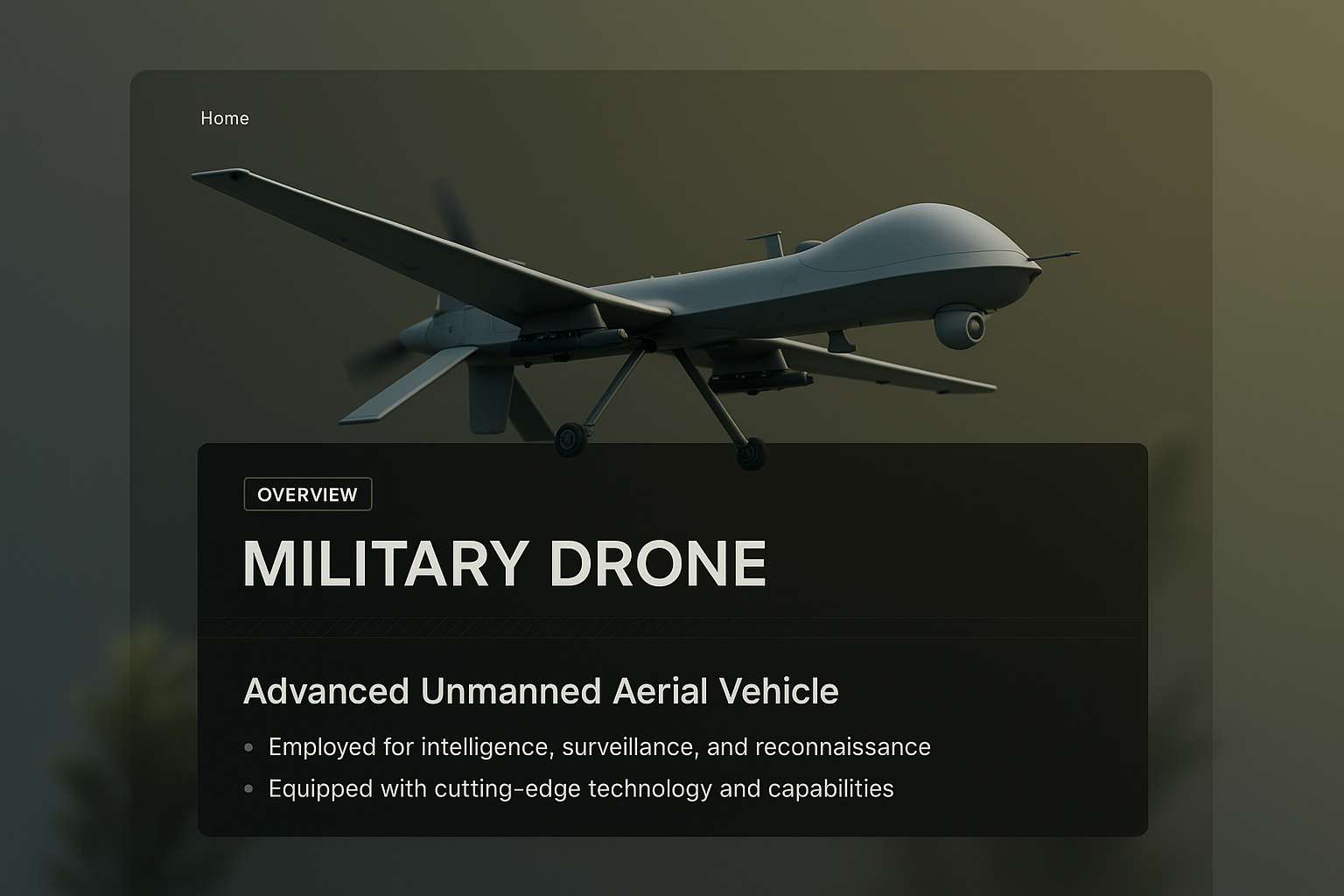 /Collection: /by davooda/Type: PNG/A detailed 3D illustration of a military drone, prominently displayed with an informative overlay. The design features a smooth gradient background that enhances the drone's realistic appearance.