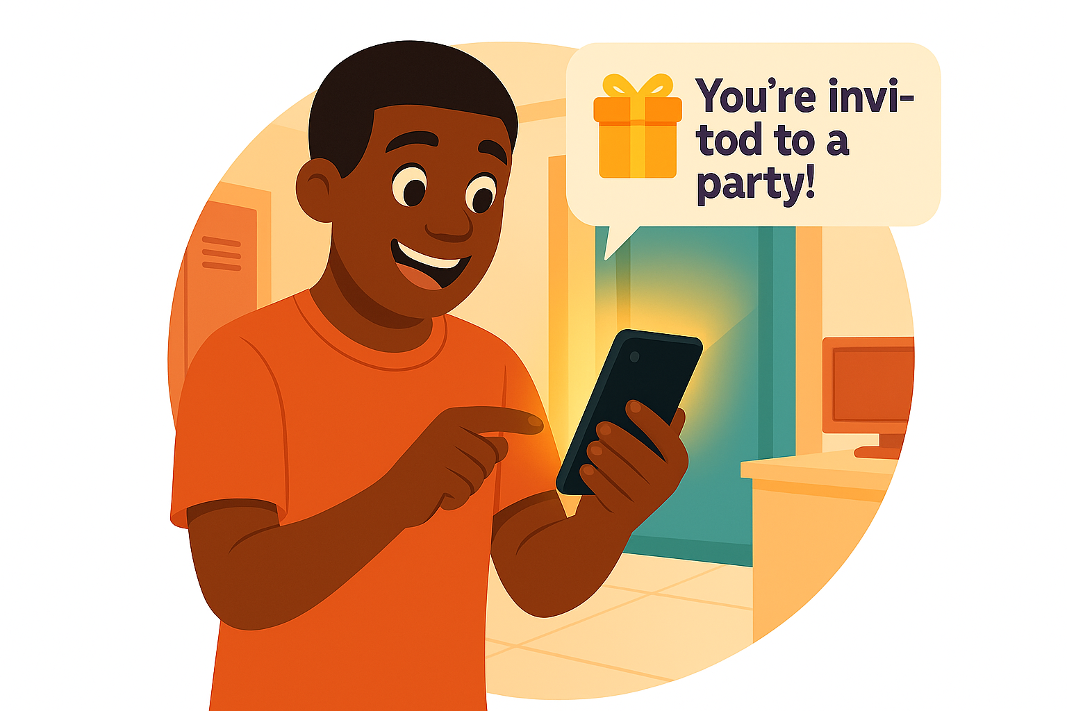 Illustrative Graphic of a Young Man Receiving a Party Invitation
