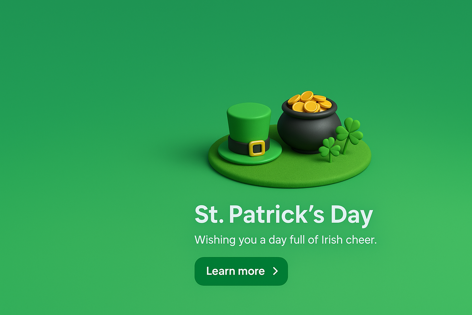 /Collection: /by davooda/Type: PNG/A festive 3D scene celebrating St. Patrick's Day, featuring a green gradient background, a leprechaun hat, a pot of gold, and clovers. The design is cohesive and visually appealing.