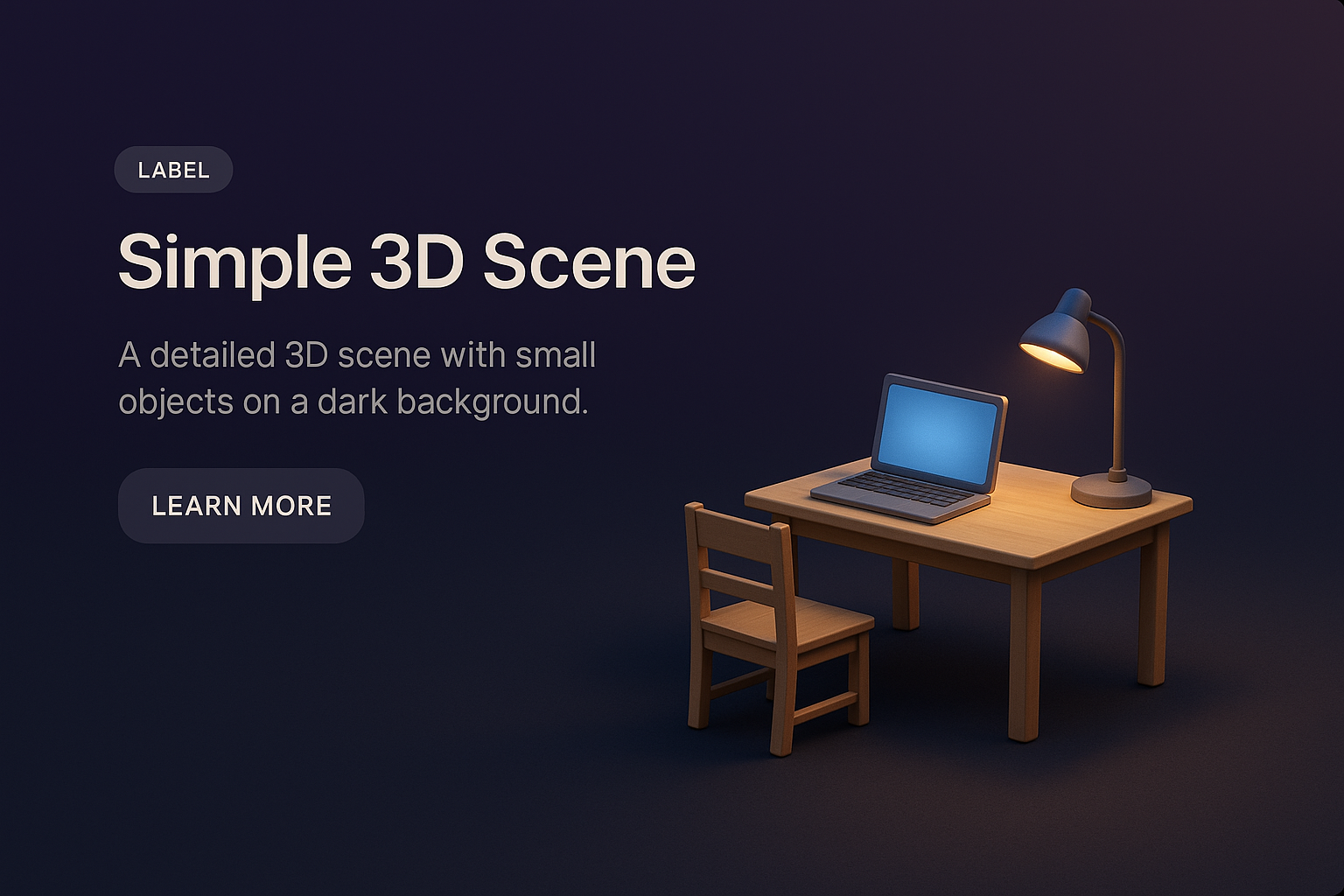 /Collection: /by davooda/Type: PNG/A realistic 3D scene featuring a small desk with a laptop and a lamp, set against a dark gradient background. The design emphasizes a clean and modern aesthetic.