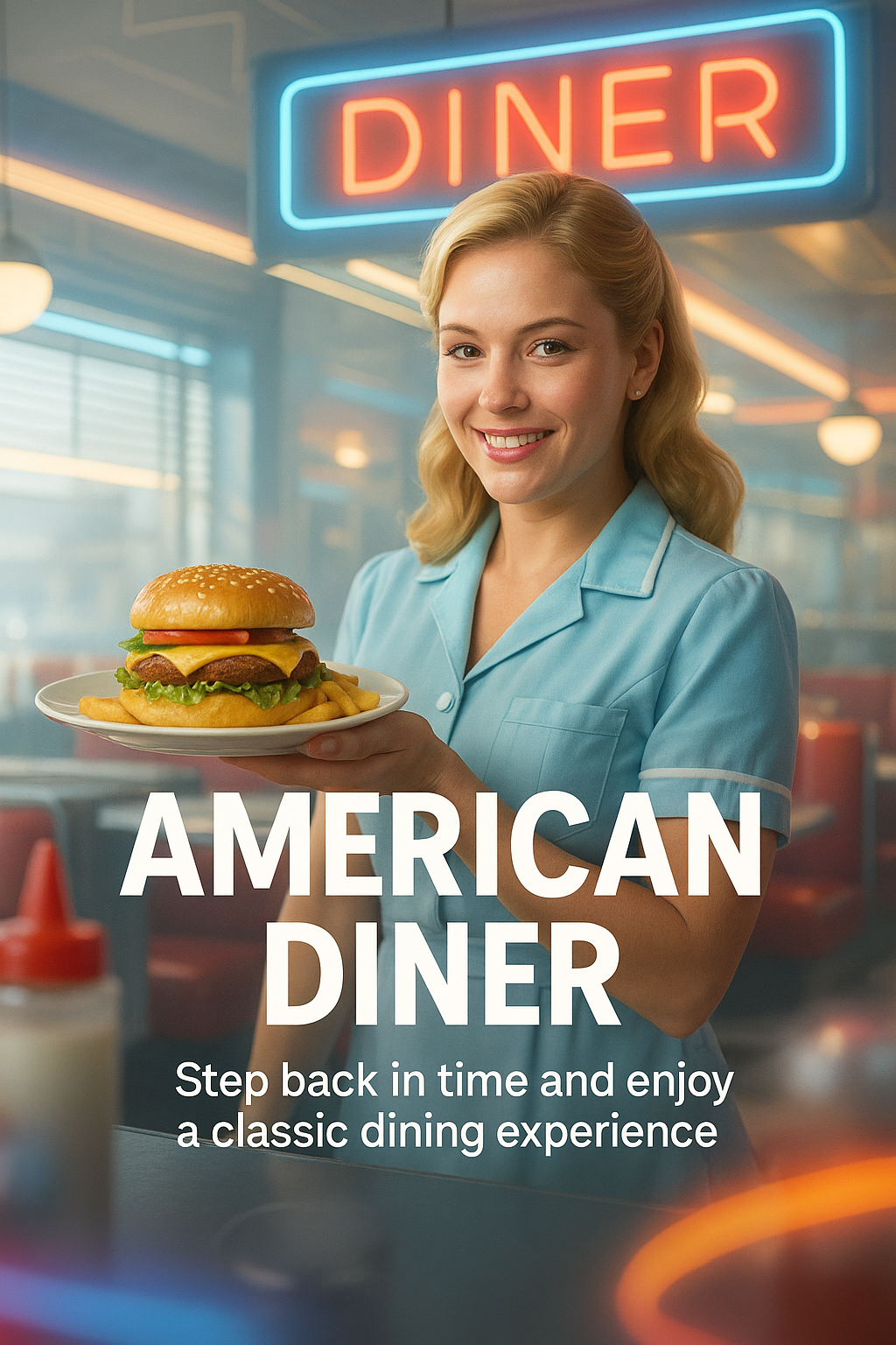 Retro Diner Promotional Image Featuring a Waitress with a Burger