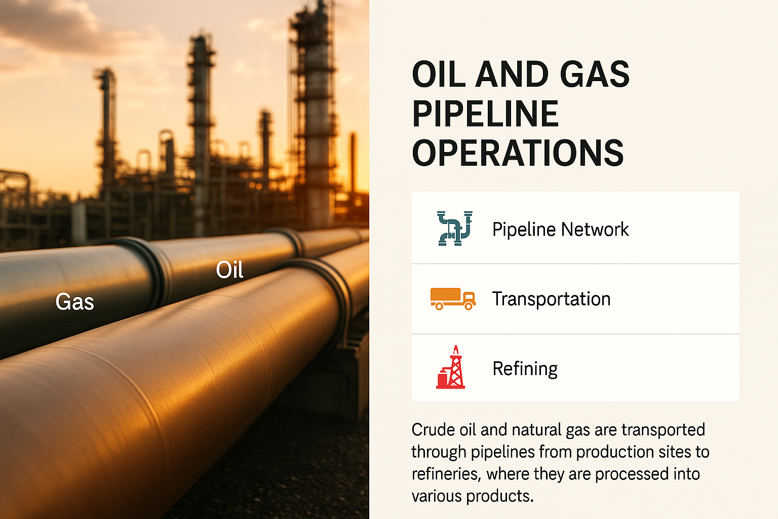 Informative infographic detailing the stages of oil and gas pipeline operations, including transportation and refining, with industrial visuals and a modern layout.