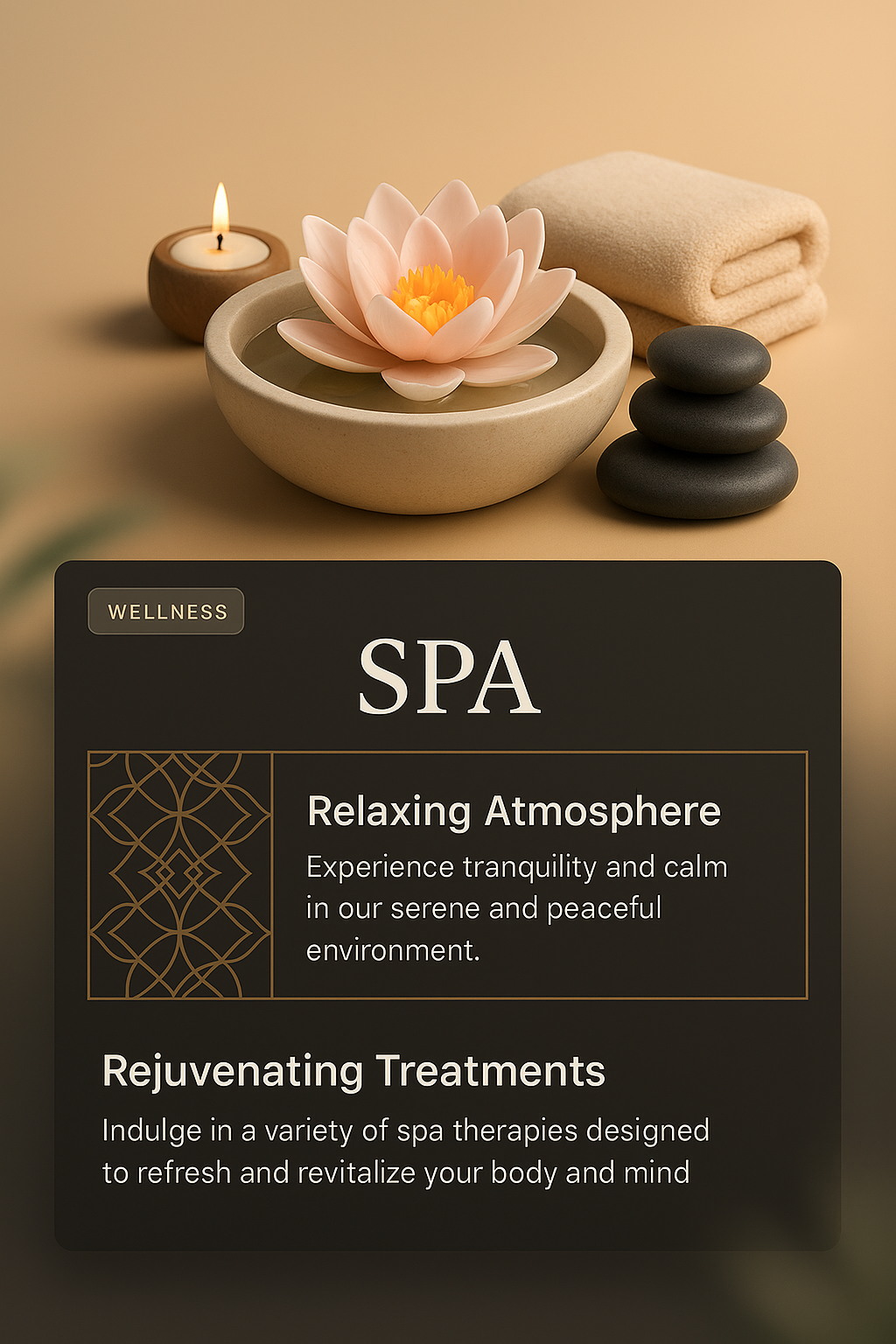 A serene spa-themed design featuring a calming 3D illustration of a lotus flower, stones, and towels. The layout includes a dark panel with wellness descriptions and patterns.