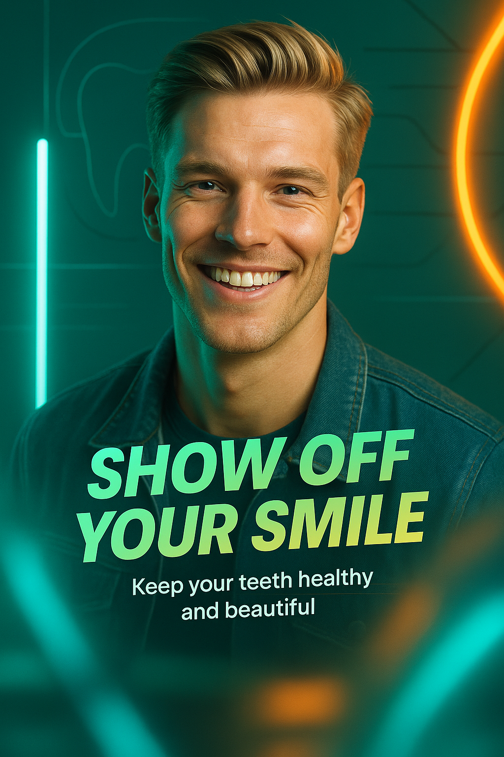 /Collection: /by davooda/Type: PNG/Vibrant promotional graphic highlighting dental health, showcasing a smiling individual against a modern background. Ideal for social media or dental clinic marketing.