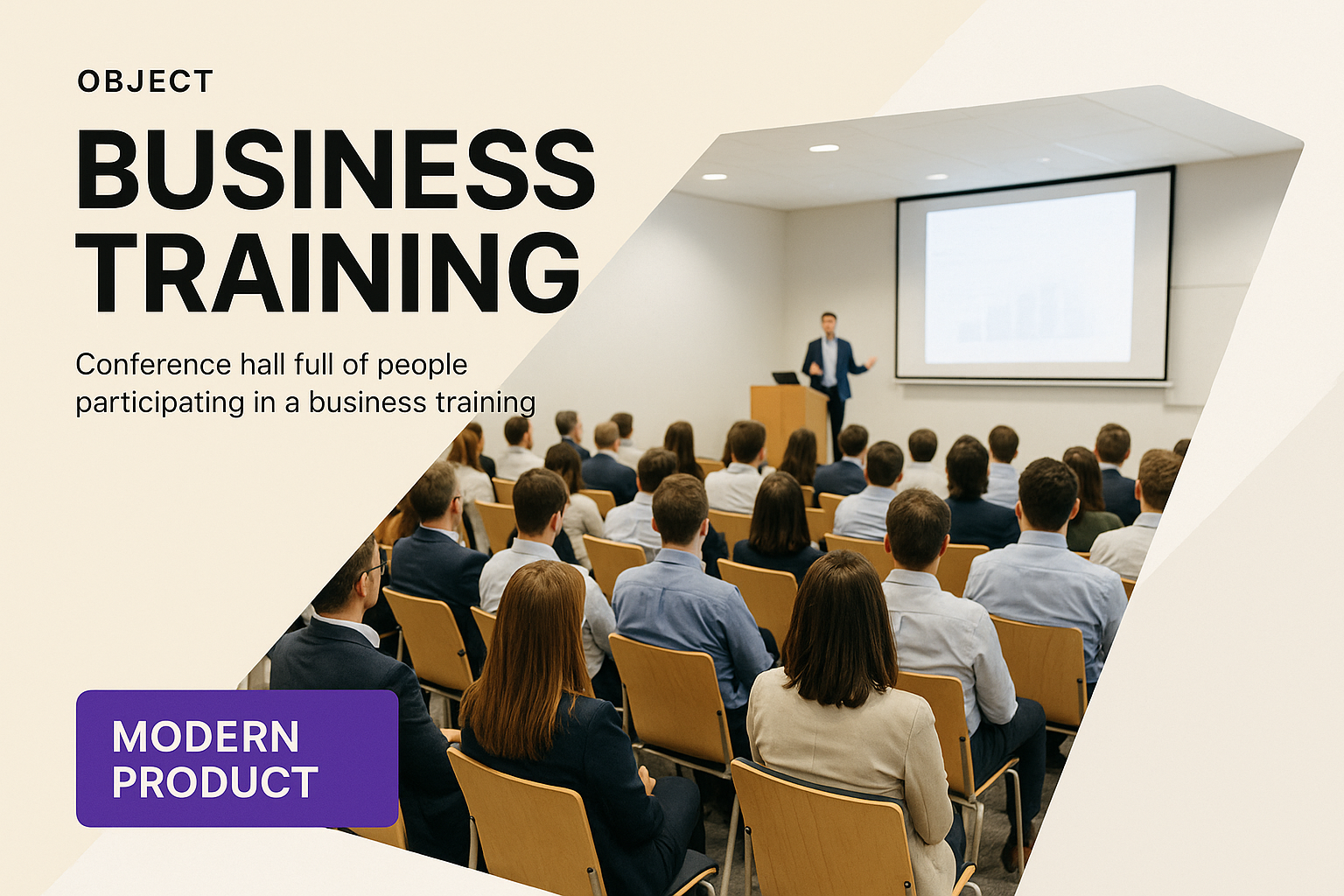 /Collection: /by davooda/Type: PNG/A dynamic scene of attendees in a modern conference hall engaged in a business training seminar. The design features a bold headline and supporting text, emphasizing the training theme.