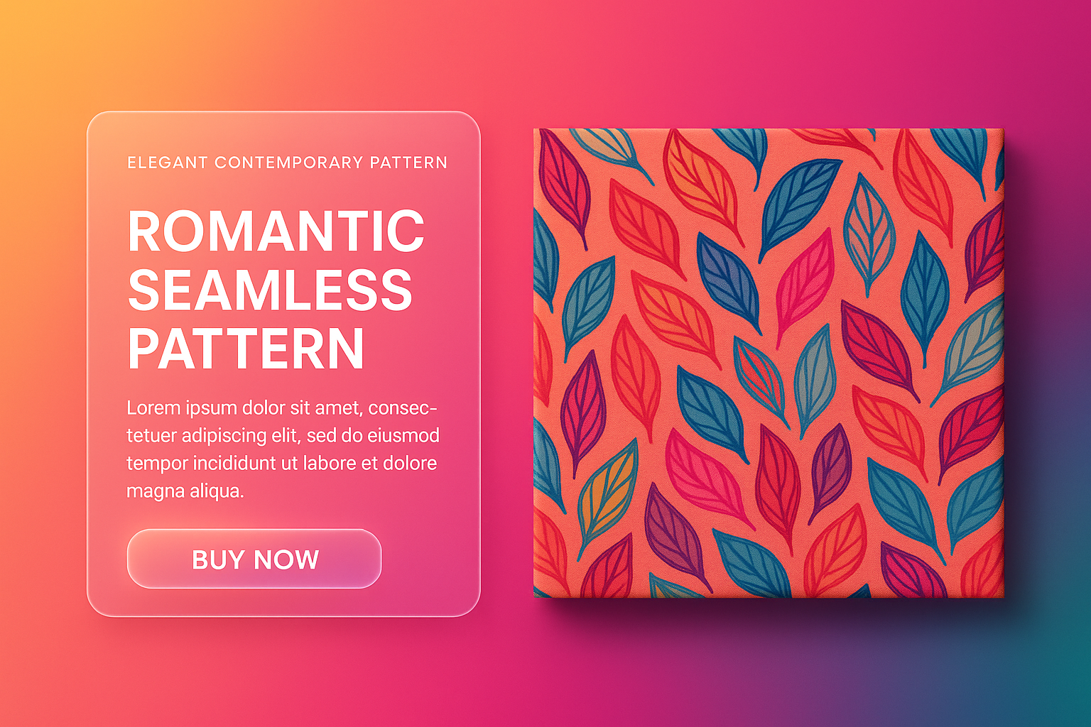This image showcases a vibrant, hand-drawn floral pattern with colorful leaves on a bright gradient background. It features a modern layout with glassmorphism elements and a call-to-action button.
