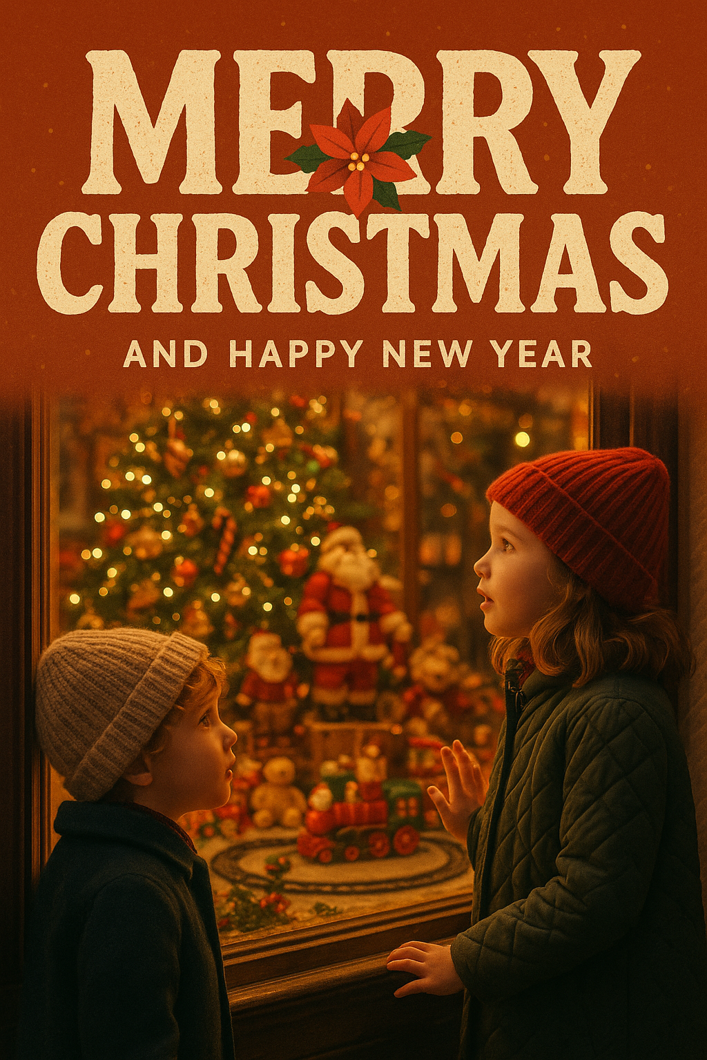 Charming holiday greeting image showcasing children admiring a Christmas scene, perfect for seasonal cards or social media posts. Warm colors and a nostalgic atmosphere enhance the festive spirit.