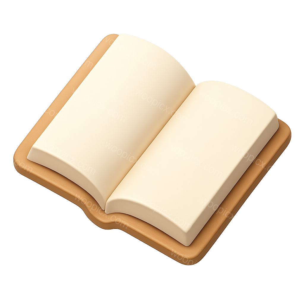 A visually appealing 3D icon of an open book, featuring a soft color palette and an isometric view. The book is depicted with a volumetric feel against a transparent background.