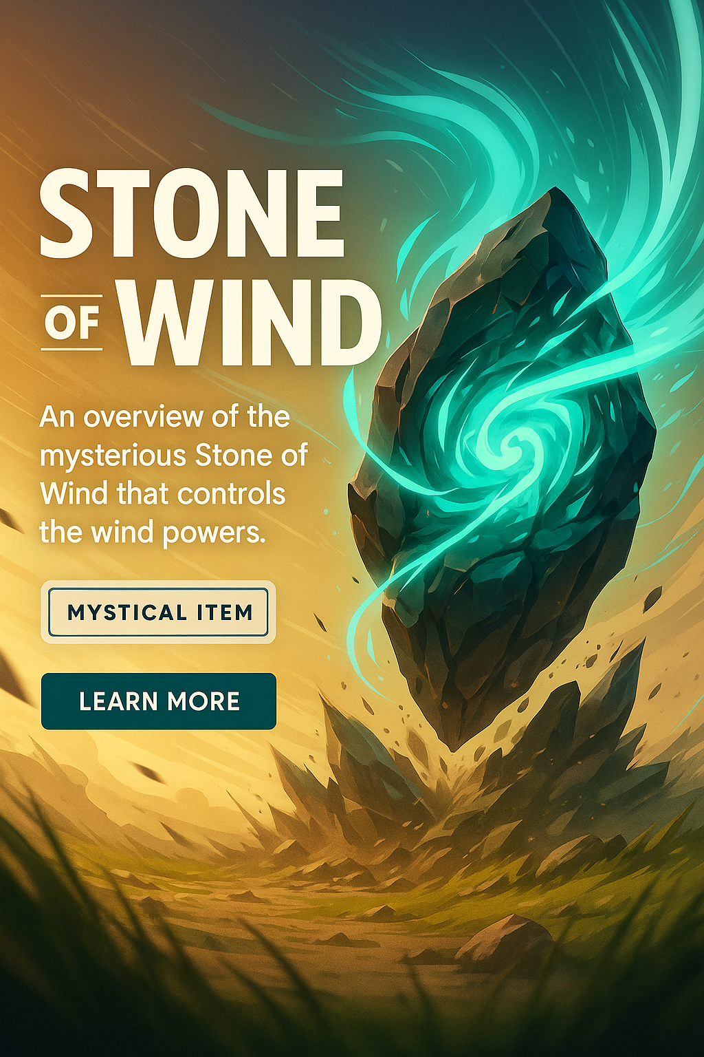 A visually striking depiction of the Stone of Wind, surrounded by swirling winds and a mystical atmosphere. The design emphasizes dynamism and engages the viewer.
