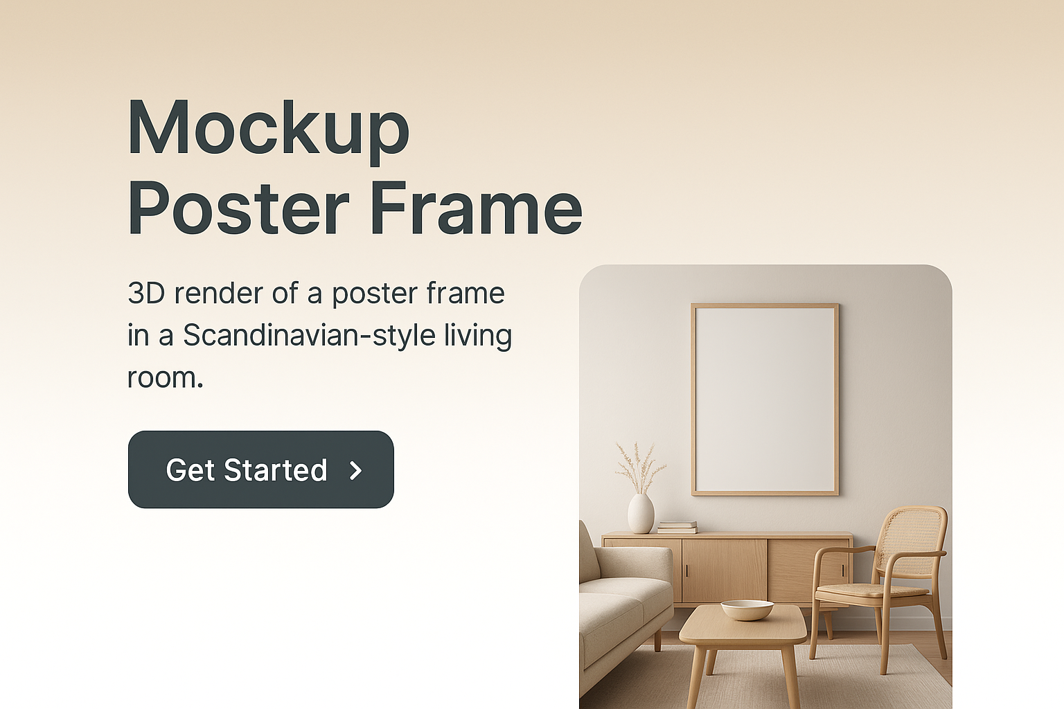 A 3D render of a Scandinavian-style living room featuring a mockup poster frame. The scene is zoomed out, showcasing a cozy, minimalistic interior design.