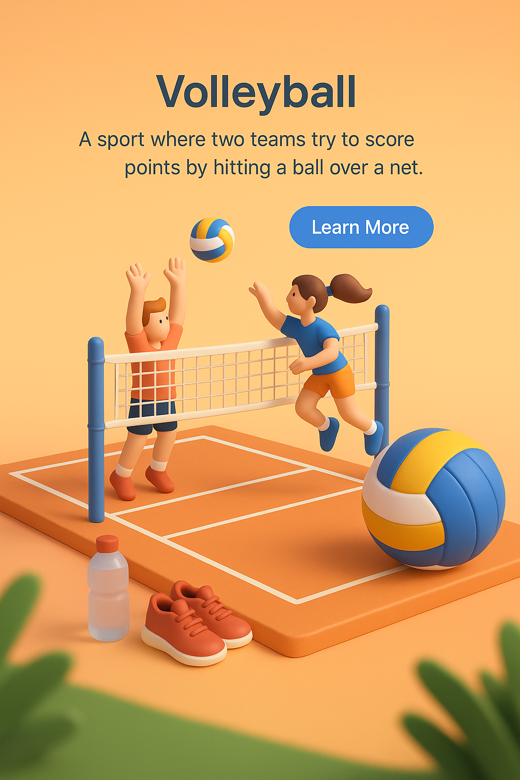 /Collection: /by davooda/Type: PNG/A vibrant 3D illustration depicting a volleyball scene with two animated characters playing. The background features a smooth gradient, with a volleyball, water bottle, and shoes in the foreground.