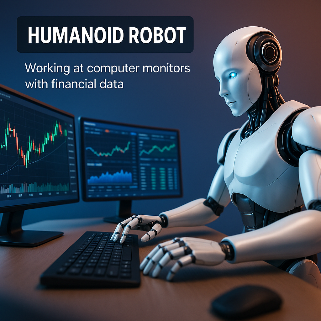 Futuristic Humanoid Robot Analyzing Financial Data at Computer Monitors