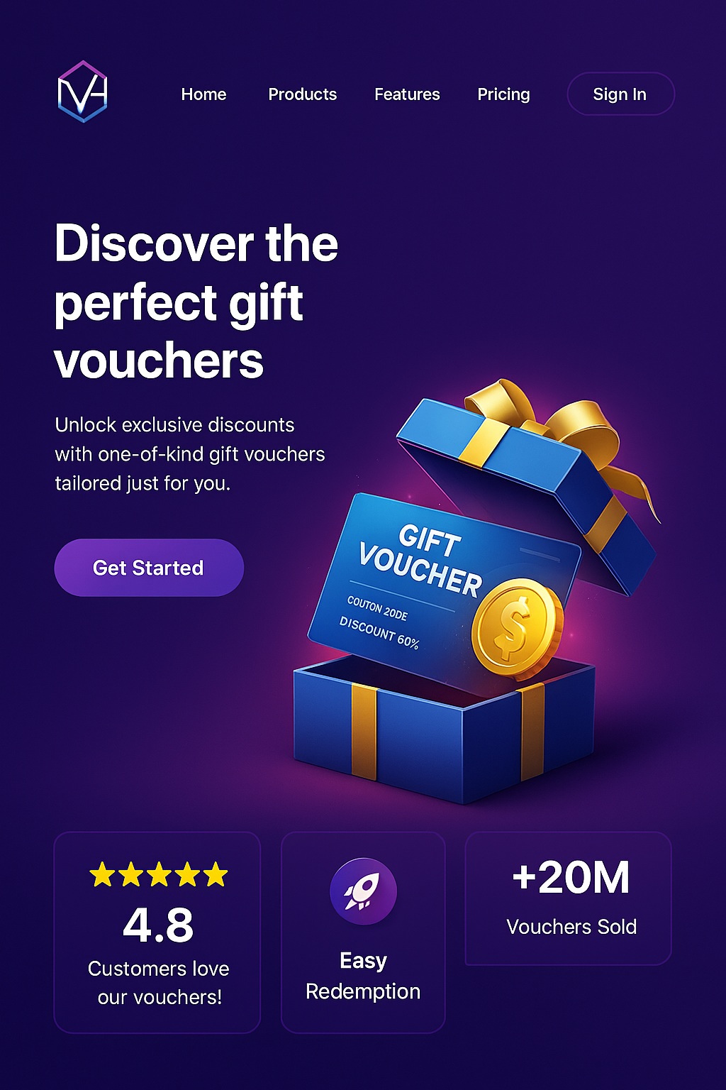 /Collection: /by davooda/Type: PNG/A visually striking landing page showcasing a gift voucher design. Features a 3D gift box, coupon code, and vibrant color gradient. Includes customer ratings and easy redemption highlights.