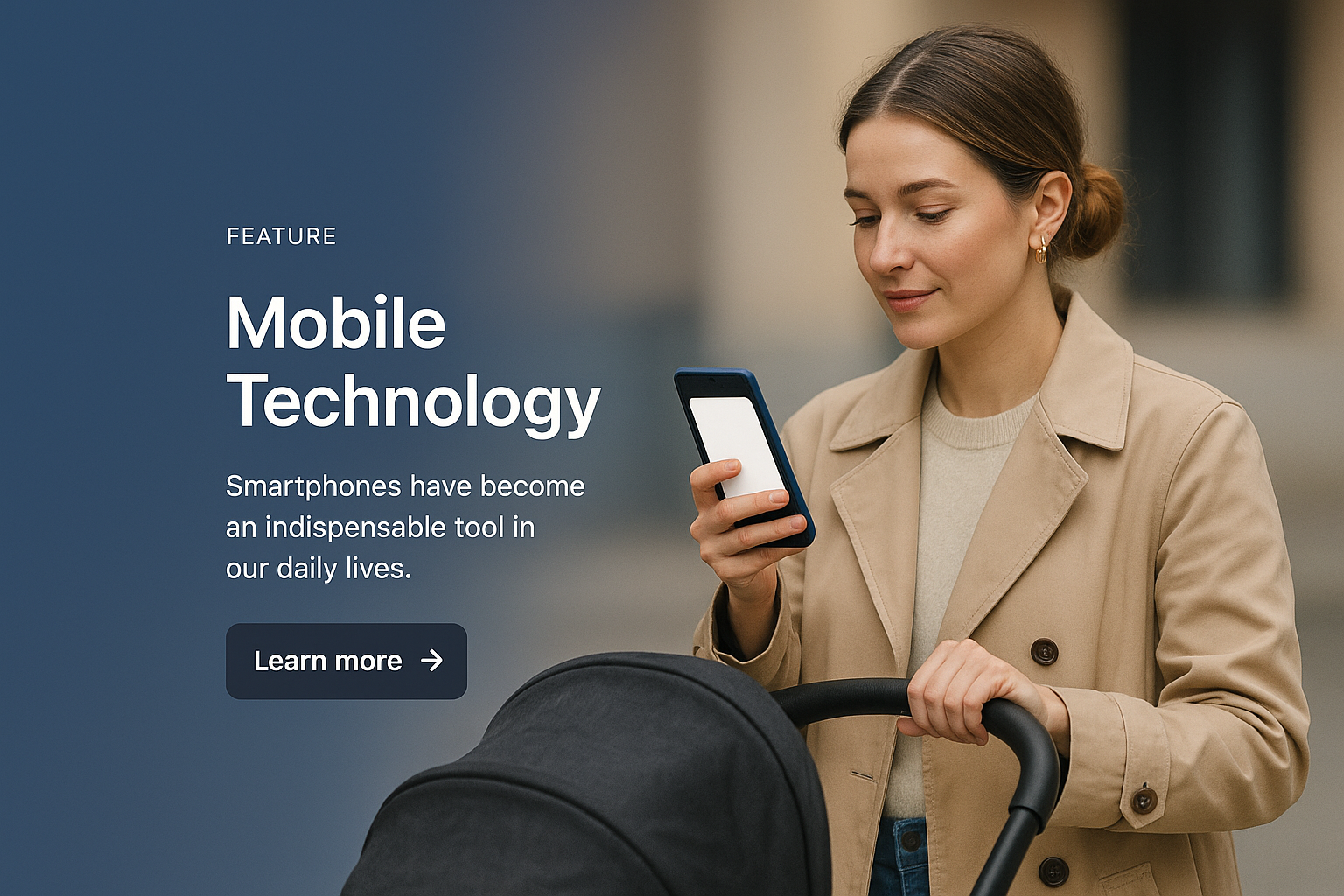 /Collection: /by davooda/Type: PNG/A young mother holds a blue smartphone in one hand while pushing a stroller. She wears a stylish coat and has a focused expression, set against a gradient background.