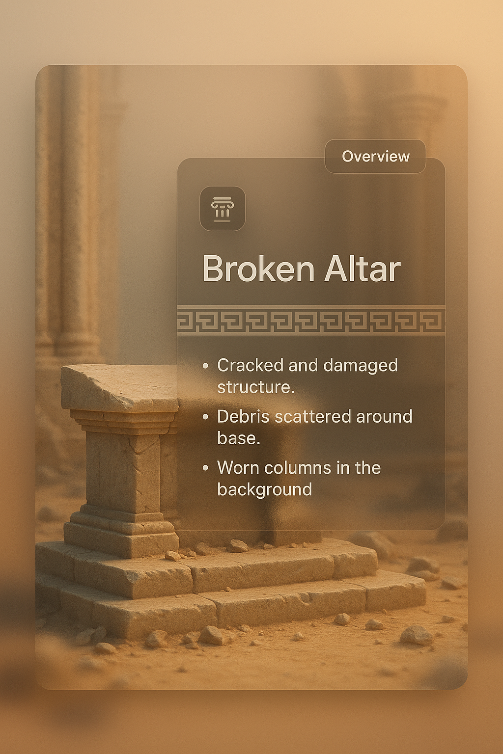 /Collection: /by davooda/Type: PNG/A 3D illustration of a broken altar, featuring a detailed overlay with descriptive text. The background includes worn columns and scattered debris, all set in a softly lit environment.