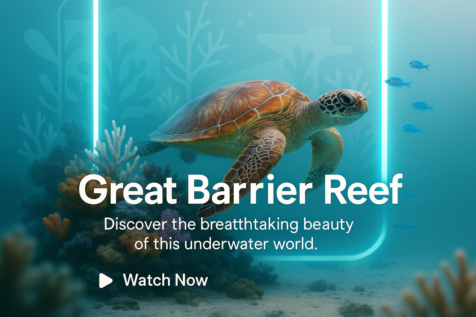 Vibrant promotional graphic showcasing the Great Barrier Reef with a sea turtle, designed to inspire exploration of marine beauty. Ideal for educational or travel-related content.