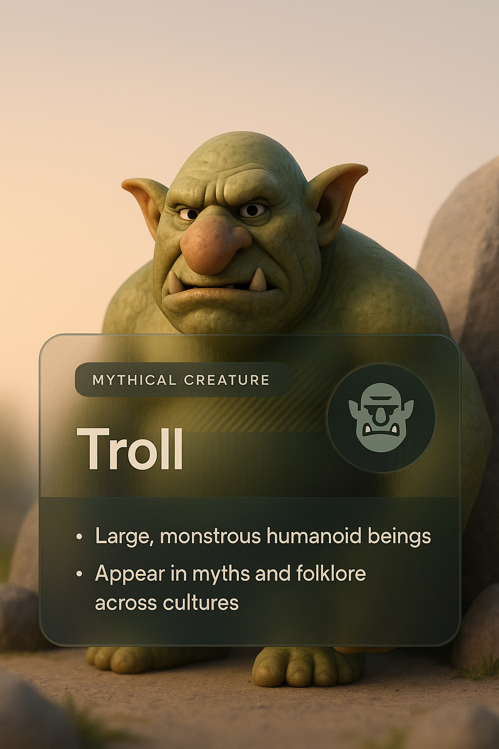 /Collection: /by davooda/Type: PNG/A detailed 3D illustration of a troll, showcasing its features with an informative overlay. The design includes a gradient background and a semi-transparent panel with text.