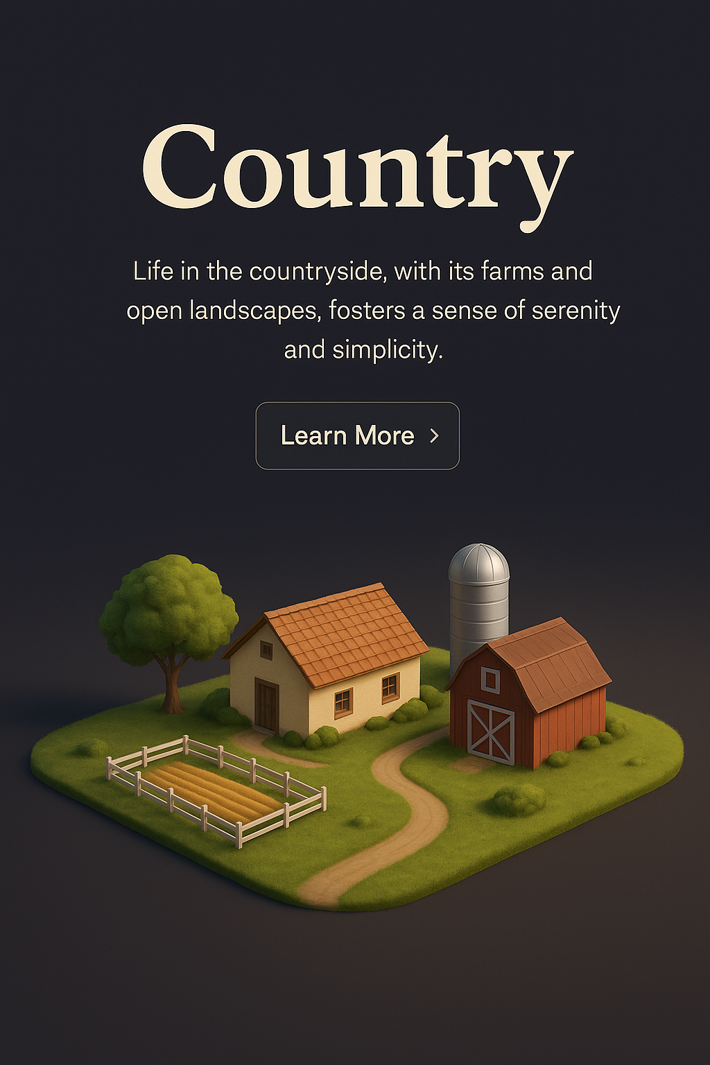 A zoomed-out 3D scene depicting a serene countryside with a farmhouse, barn, and silo. The dark gradient background enhances the vibrant colors of the landscape elements, featuring a path and trees.